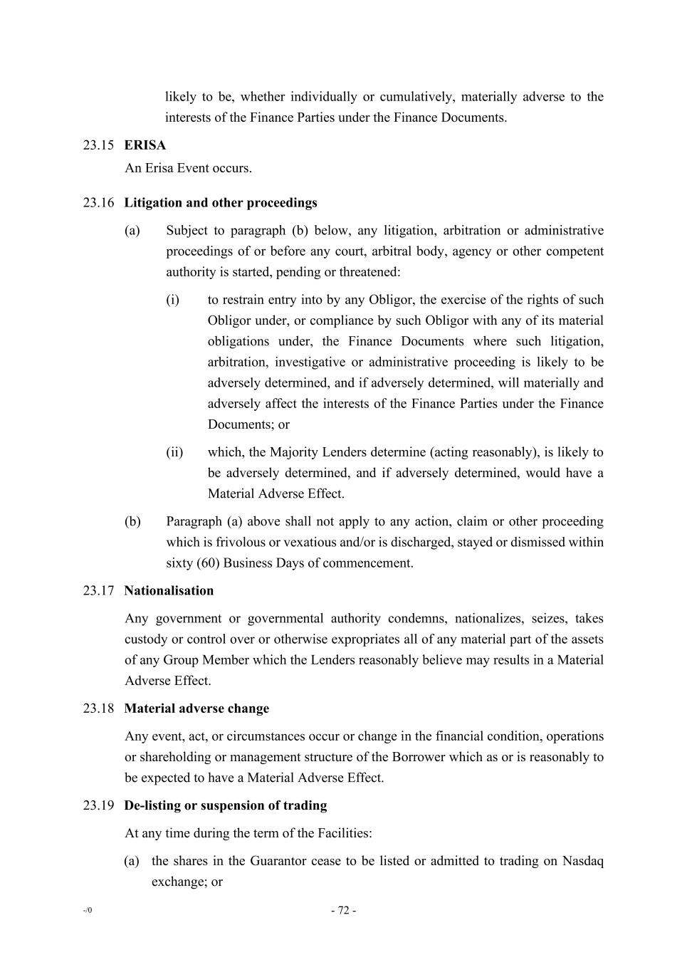 -/0 - 72 - likely to be, whether individually or cumulatively, materially adverse to the interests of the Finance Parties under the Finance Documents. 23.15 ERISA An Erisa Event occurs. 23.16 Litigation and other proceedings (a) Subject to paragraph (b) below, any litigation, arbitration or administrative proceedings of or before any court, arbitral body, agency or other competent authority is started, pending or threatened: (i) to restrain entry into by any Obligor, the exercise of the rights of such Obligor under, or compliance by such Obligor with any of its material obligations under, the Finance Documents where such litigation, arbitration, investigative or administrative proceeding is likely to be adversely determined, and if adversely determined, will materially and adversely affect the interests of the Finance Parties under the Finance Documents; or (ii) which, the Majority Lenders determine (acting reasonably), is likely to be adversely determined, and if adversely determined, would have a Material Adverse Effect. (b) Paragraph (a) above shall not apply to any action, claim or other proceeding which is frivolous or vexatious and/or is discharged, stayed or dismissed within sixty (60) Business Days of commencement. 23.17 Nationalisation Any government or governmental authority condemns, nationalizes, seizes, takes custody or control over or otherwise expropriates all of any material part of the assets of any Group Member which the Lenders reasonably believe may results in a Material Adverse Effect. 23.18 Material adverse change Any event, act, or circumstances occur or change in the financial condition, operations or shareholding or management structure of the Borrower which as or is reasonably to be expected to have a Material Adverse Effect. 23.19 De-listing or suspension of trading At any time during the term of the Facilities: (a) the shares in the Guarantor cease to be listed or admitted to trading on Nasdaq exchange; or