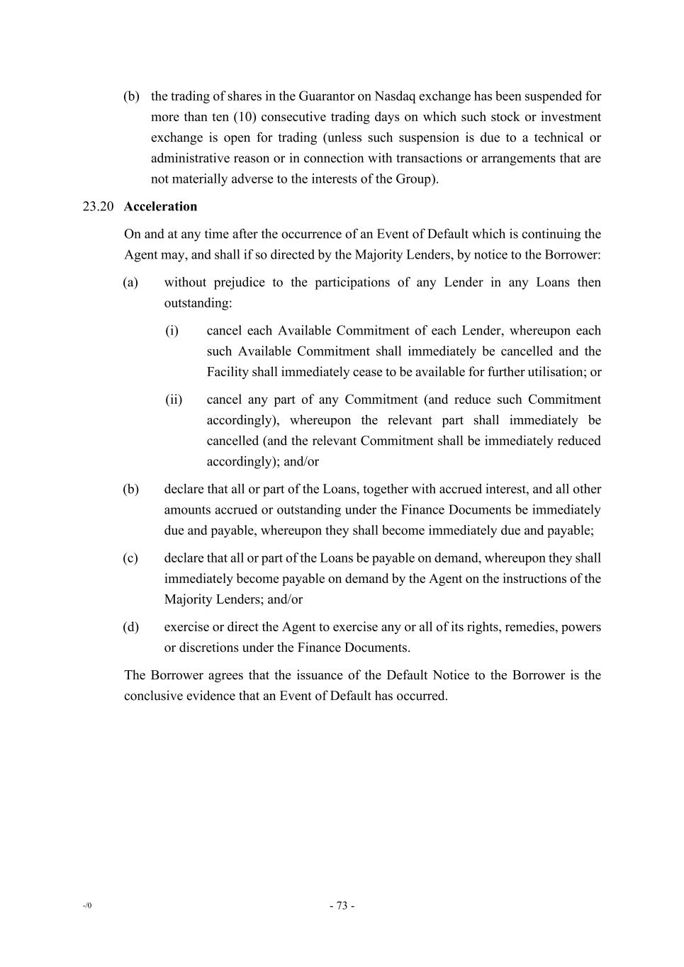 -/0 - 73 - (b) the trading of shares in the Guarantor on Nasdaq exchange has been suspended for more than ten (10) consecutive trading days on which such stock or investment exchange is open for trading (unless such suspension is due to a technical or administrative reason or in connection with transactions or arrangements that are not materially adverse to the interests of the Group). 23.20 Acceleration On and at any time after the occurrence of an Event of Default which is continuing the Agent may, and shall if so directed by the Majority Lenders, by notice to the Borrower: (a) without prejudice to the participations of any Lender in any Loans then outstanding: (i) cancel each Available Commitment of each Lender, whereupon each such Available Commitment shall immediately be cancelled and the Facility shall immediately cease to be available for further utilisation; or (ii) cancel any part of any Commitment (and reduce such Commitment accordingly), whereupon the relevant part shall immediately be cancelled (and the relevant Commitment shall be immediately reduced accordingly); and/or (b) declare that all or part of the Loans, together with accrued interest, and all other amounts accrued or outstanding under the Finance Documents be immediately due and payable, whereupon they shall become immediately due and payable; (c) declare that all or part of the Loans be payable on demand, whereupon they shall immediately become payable on demand by the Agent on the instructions of the Majority Lenders; and/or (d) exercise or direct the Agent to exercise any or all of its rights, remedies, powers or discretions under the Finance Documents. The Borrower agrees that the issuance of the Default Notice to the Borrower is the conclusive evidence that an Event of Default has occurred.