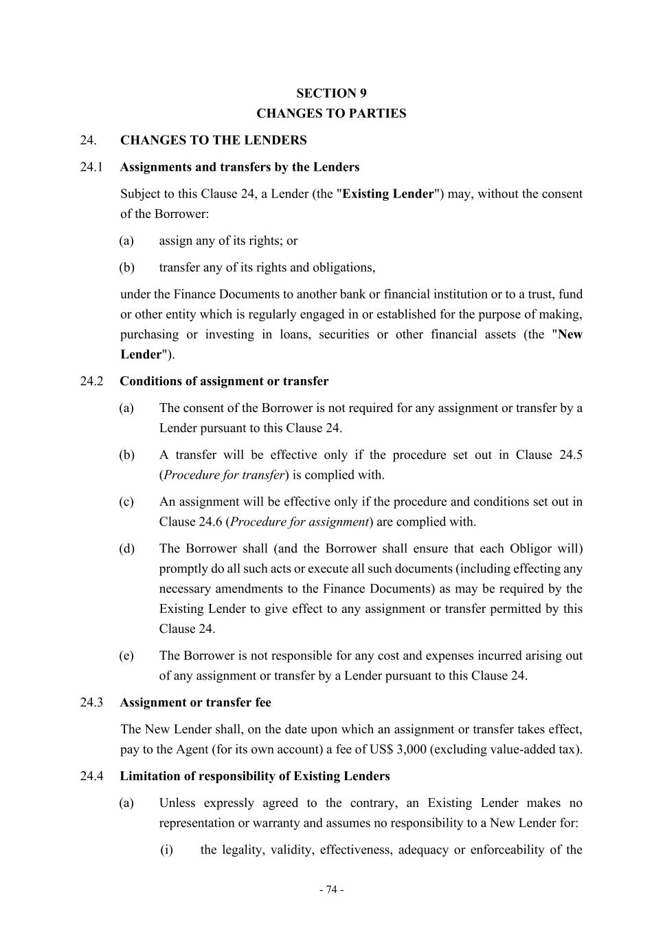 - 74 - SECTION 9 CHANGES TO PARTIES 24. CHANGES TO THE LENDERS 24.1 Assignments and transfers by the Lenders Subject to this Clause 24, a Lender (the "Existing Lender") may, without the consent of the Borrower: (a) assign any of its rights; or (b) transfer any of its rights and obligations, under the Finance Documents to another bank or financial institution or to a trust, fund or other entity which is regularly engaged in or established for the purpose of making, purchasing or investing in loans, securities or other financial assets (the "New Lender"). 24.2 Conditions of assignment or transfer (a) The consent of the Borrower is not required for any assignment or transfer by a Lender pursuant to this Clause 24. (b) A transfer will be effective only if the procedure set out in Clause 24.5 (Procedure for transfer) is complied with. (c) An assignment will be effective only if the procedure and conditions set out in Clause 24.6 (Procedure for assignment) are complied with. (d) The Borrower shall (and the Borrower shall ensure that each Obligor will) promptly do all such acts or execute all such documents (including effecting any necessary amendments to the Finance Documents) as may be required by the Existing Lender to give effect to any assignment or transfer permitted by this Clause 24. (e) The Borrower is not responsible for any cost and expenses incurred arising out of any assignment or transfer by a Lender pursuant to this Clause 24. 24.3 Assignment or transfer fee The New Lender shall, on the date upon which an assignment or transfer takes effect, pay to the Agent (for its own account) a fee of US$ 3,000 (excluding value-added tax). 24.4 Limitation of responsibility of Existing Lenders (a) Unless expressly agreed to the contrary, an Existing Lender makes no representation or warranty and assumes no responsibility to a New Lender for: (i) the legality, validity, effectiveness, adequacy or enforceability of the