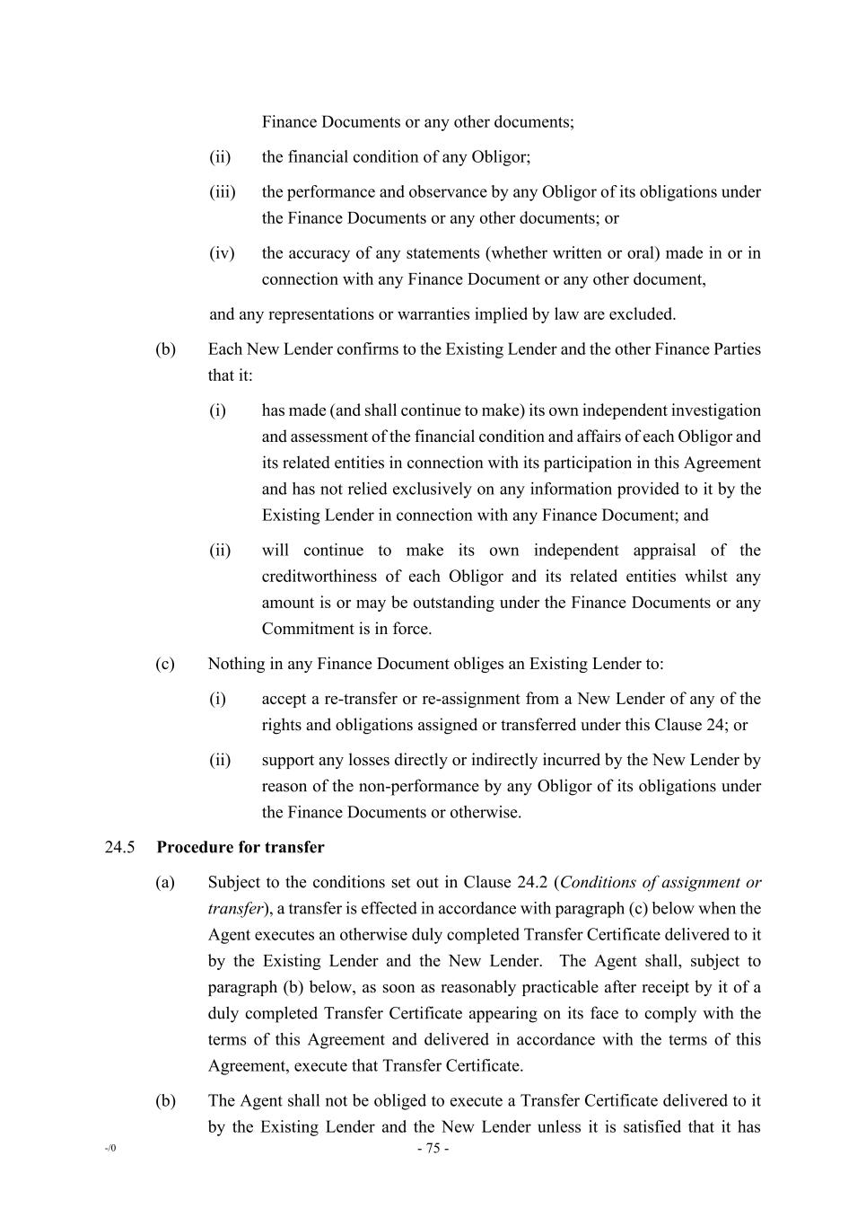 -/0 - 75 - Finance Documents or any other documents; (ii) the financial condition of any Obligor; (iii) the performance and observance by any Obligor of its obligations under the Finance Documents or any other documents; or (iv) the accuracy of any statements (whether written or oral) made in or in connection with any Finance Document or any other document, and any representations or warranties implied by law are excluded. (b) Each New Lender confirms to the Existing Lender and the other Finance Parties that it: (i) has made (and shall continue to make) its own independent investigation and assessment of the financial condition and affairs of each Obligor and its related entities in connection with its participation in this Agreement and has not relied exclusively on any information provided to it by the Existing Lender in connection with any Finance Document; and (ii) will continue to make its own independent appraisal of the creditworthiness of each Obligor and its related entities whilst any amount is or may be outstanding under the Finance Documents or any Commitment is in force. (c) Nothing in any Finance Document obliges an Existing Lender to: (i) accept a re-transfer or re-assignment from a New Lender of any of the rights and obligations assigned or transferred under this Clause 24; or (ii) support any losses directly or indirectly incurred by the New Lender by reason of the non-performance by any Obligor of its obligations under the Finance Documents or otherwise. 24.5 Procedure for transfer (a) Subject to the conditions set out in Clause 24.2 (Conditions of assignment or transfer), a transfer is effected in accordance with paragraph (c) below when the Agent executes an otherwise duly completed Transfer Certificate delivered to it by the Existing Lender and the New Lender. The Agent shall, subject to paragraph (b) below, as soon as reasonably practicable after receipt by it of a duly completed Transfer Certificate appearing on its face to comply with the terms of this Agreement and delivered in accordance with the terms of this Agreement, execute that Transfer Certificate. (b) The Agent shall not be obliged to execute a Transfer Certificate delivered to it by the Existing Lender and the New Lender unless it is satisfied that it has