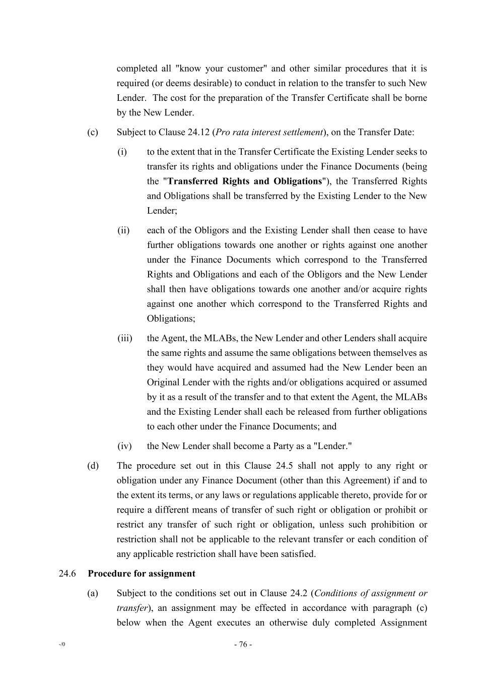 -/0 - 76 - completed all "know your customer" and other similar procedures that it is required (or deems desirable) to conduct in relation to the transfer to such New Lender. The cost for the preparation of the Transfer Certificate shall be borne by the New Lender. (c) Subject to Clause 24.12 (Pro rata interest settlement), on the Transfer Date: (i) to the extent that in the Transfer Certificate the Existing Lender seeks to transfer its rights and obligations under the Finance Documents (being the "Transferred Rights and Obligations"), the Transferred Rights and Obligations shall be transferred by the Existing Lender to the New Lender; (ii) each of the Obligors and the Existing Lender shall then cease to have further obligations towards one another or rights against one another under the Finance Documents which correspond to the Transferred Rights and Obligations and each of the Obligors and the New Lender shall then have obligations towards one another and/or acquire rights against one another which correspond to the Transferred Rights and Obligations; (iii) the Agent, the MLABs, the New Lender and other Lenders shall acquire the same rights and assume the same obligations between themselves as they would have acquired and assumed had the New Lender been an Original Lender with the rights and/or obligations acquired or assumed by it as a result of the transfer and to that extent the Agent, the MLABs and the Existing Lender shall each be released from further obligations to each other under the Finance Documents; and (iv) the New Lender shall become a Party as a "Lender." (d) The procedure set out in this Clause 24.5 shall not apply to any right or obligation under any Finance Document (other than this Agreement) if and to the extent its terms, or any laws or regulations applicable thereto, provide for or require a different means of transfer of such right or obligation or prohibit or restrict any transfer of such right or obligation, unless such prohibition or restriction shall not be applicable to the relevant transfer or each condition of any applicable restriction shall have been satisfied. 24.6 Procedure for assignment (a) Subject to the conditions set out in Clause 24.2 (Conditions of assignment or transfer), an assignment may be effected in accordance with paragraph (c) below when the Agent executes an otherwise duly completed Assignment