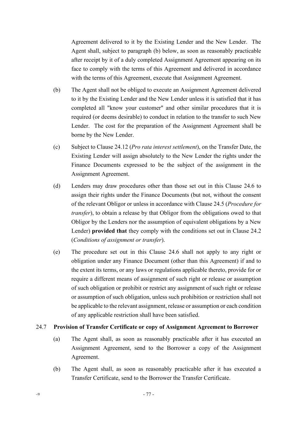 -/0 - 77 - Agreement delivered to it by the Existing Lender and the New Lender. The Agent shall, subject to paragraph (b) below, as soon as reasonably practicable after receipt by it of a duly completed Assignment Agreement appearing on its face to comply with the terms of this Agreement and delivered in accordance with the terms of this Agreement, execute that Assignment Agreement. (b) The Agent shall not be obliged to execute an Assignment Agreement delivered to it by the Existing Lender and the New Lender unless it is satisfied that it has completed all "know your customer" and other similar procedures that it is required (or deems desirable) to conduct in relation to the transfer to such New Lender. The cost for the preparation of the Assignment Agreement shall be borne by the New Lender. (c) Subject to Clause 24.12 (Pro rata interest settlement), on the Transfer Date, the Existing Lender will assign absolutely to the New Lender the rights under the Finance Documents expressed to be the subject of the assignment in the Assignment Agreement. (d) Lenders may draw procedures other than those set out in this Clause 24.6 to assign their rights under the Finance Documents (but not, without the consent of the relevant Obligor or unless in accordance with Clause 24.5 (Procedure for transfer), to obtain a release by that Obligor from the obligations owed to that Obligor by the Lenders nor the assumption of equivalent obligations by a New Lender) provided that they comply with the conditions set out in Clause 24.2 (Conditions of assignment or transfer). (e) The procedure set out in this Clause 24.6 shall not apply to any right or obligation under any Finance Document (other than this Agreement) if and to the extent its terms, or any laws or regulations applicable thereto, provide for or require a different means of assignment of such right or release or assumption of such obligation or prohibit or restrict any assignment of such right or release or assumption of such obligation, unless such prohibition or restriction shall not be applicable to the relevant assignment, release or assumption or each condition of any applicable restriction shall have been satisfied. 24.7 Provision of Transfer Certificate or copy of Assignment Agreement to Borrower (a) The Agent shall, as soon as reasonably practicable after it has executed an Assignment Agreement, send to the Borrower a copy of the Assignment Agreement. (b) The Agent shall, as soon as reasonably practicable after it has executed a Transfer Certificate, send to the Borrower the Transfer Certificate.