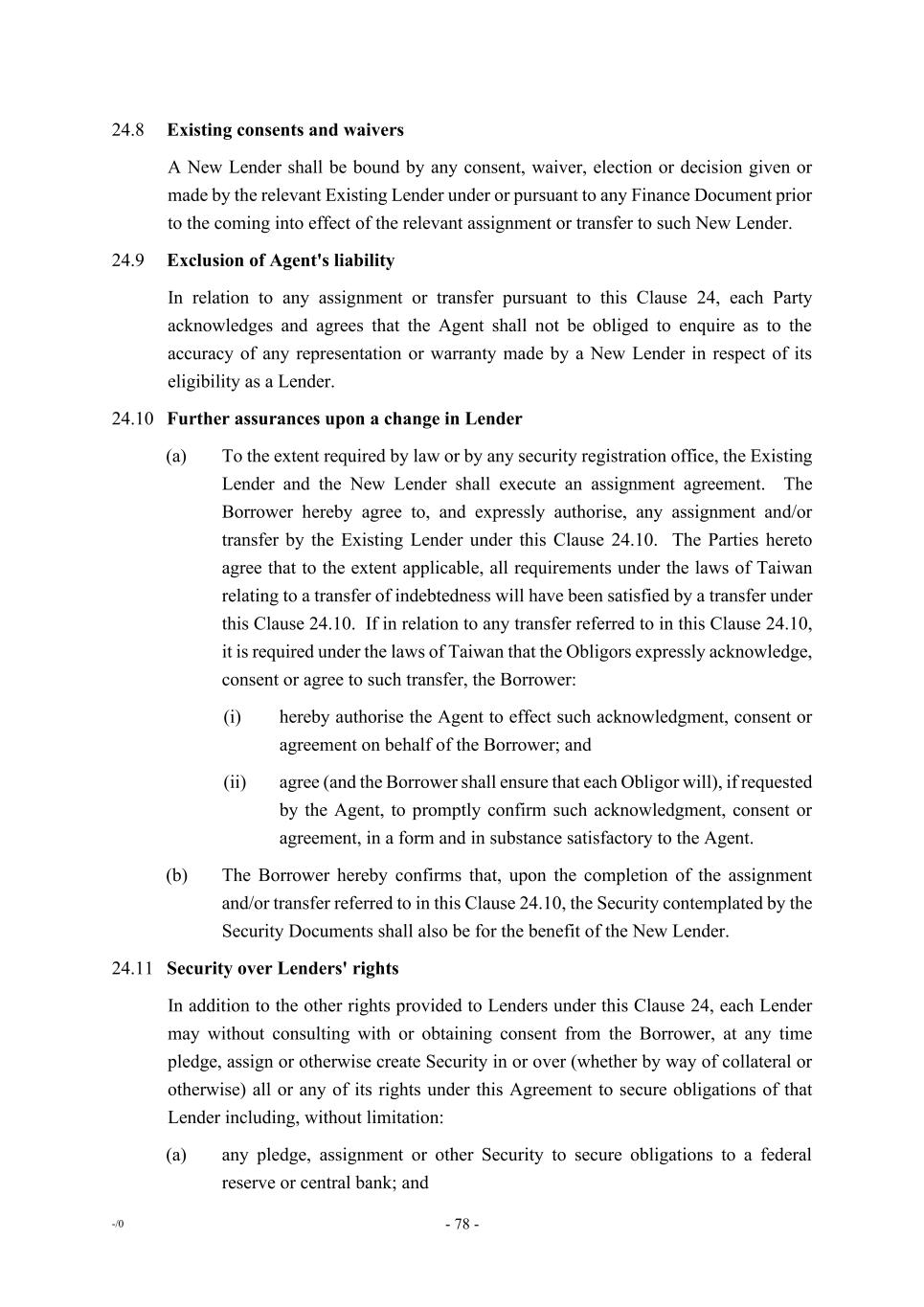 -/0 - 78 - 24.8 Existing consents and waivers A New Lender shall be bound by any consent, waiver, election or decision given or made by the relevant Existing Lender under or pursuant to any Finance Document prior to the coming into effect of the relevant assignment or transfer to such New Lender. 24.9 Exclusion of Agent's liability In relation to any assignment or transfer pursuant to this Clause 24, each Party acknowledges and agrees that the Agent shall not be obliged to enquire as to the accuracy of any representation or warranty made by a New Lender in respect of its eligibility as a Lender. 24.10 Further assurances upon a change in Lender (a) To the extent required by law or by any security registration office, the Existing Lender and the New Lender shall execute an assignment agreement. The Borrower hereby agree to, and expressly authorise, any assignment and/or transfer by the Existing Lender under this Clause 24.10. The Parties hereto agree that to the extent applicable, all requirements under the laws of Taiwan relating to a transfer of indebtedness will have been satisfied by a transfer under this Clause 24.10. If in relation to any transfer referred to in this Clause 24.10, it is required under the laws of Taiwan that the Obligors expressly acknowledge, consent or agree to such transfer, the Borrower: (i) hereby authorise the Agent to effect such acknowledgment, consent or agreement on behalf of the Borrower; and (ii) agree (and the Borrower shall ensure that each Obligor will), if requested by the Agent, to promptly confirm such acknowledgment, consent or agreement, in a form and in substance satisfactory to the Agent. (b) The Borrower hereby confirms that, upon the completion of the assignment and/or transfer referred to in this Clause 24.10, the Security contemplated by the Security Documents shall also be for the benefit of the New Lender. 24.11 Security over Lenders' rights In addition to the other rights provided to Lenders under this Clause 24, each Lender may without consulting with or obtaining consent from the Borrower, at any time pledge, assign or otherwise create Security in or over (whether by way of collateral or otherwise) all or any of its rights under this Agreement to secure obligations of that Lender including, without limitation: (a) any pledge, assignment or other Security to secure obligations to a federal reserve or central bank; and