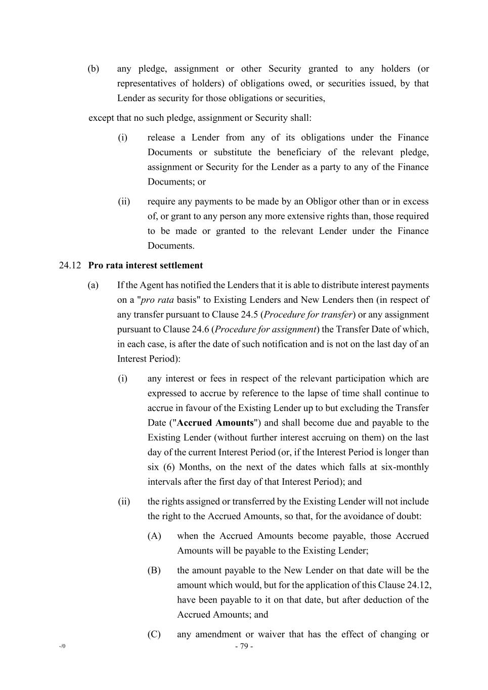 -/0 - 79 - (b) any pledge, assignment or other Security granted to any holders (or representatives of holders) of obligations owed, or securities issued, by that Lender as security for those obligations or securities, except that no such pledge, assignment or Security shall: (i) release a Lender from any of its obligations under the Finance Documents or substitute the beneficiary of the relevant pledge, assignment or Security for the Lender as a party to any of the Finance Documents; or (ii) require any payments to be made by an Obligor other than or in excess of, or grant to any person any more extensive rights than, those required to be made or granted to the relevant Lender under the Finance Documents. 24.12 Pro rata interest settlement (a) If the Agent has notified the Lenders that it is able to distribute interest payments on a "pro rata basis" to Existing Lenders and New Lenders then (in respect of any transfer pursuant to Clause 24.5 (Procedure for transfer) or any assignment pursuant to Clause 24.6 (Procedure for assignment) the Transfer Date of which, in each case, is after the date of such notification and is not on the last day of an Interest Period): (i) any interest or fees in respect of the relevant participation which are expressed to accrue by reference to the lapse of time shall continue to accrue in favour of the Existing Lender up to but excluding the Transfer Date ("Accrued Amounts") and shall become due and payable to the Existing Lender (without further interest accruing on them) on the last day of the current Interest Period (or, if the Interest Period is longer than six (6) Months, on the next of the dates which falls at six-monthly intervals after the first day of that Interest Period); and (ii) the rights assigned or transferred by the Existing Lender will not include the right to the Accrued Amounts, so that, for the avoidance of doubt: (A) when the Accrued Amounts become payable, those Accrued Amounts will be payable to the Existing Lender; (B) the amount payable to the New Lender on that date will be the amount which would, but for the application of this Clause 24.12, have been payable to it on that date, but after deduction of the Accrued Amounts; and (C) any amendment or waiver that has the effect of changing or