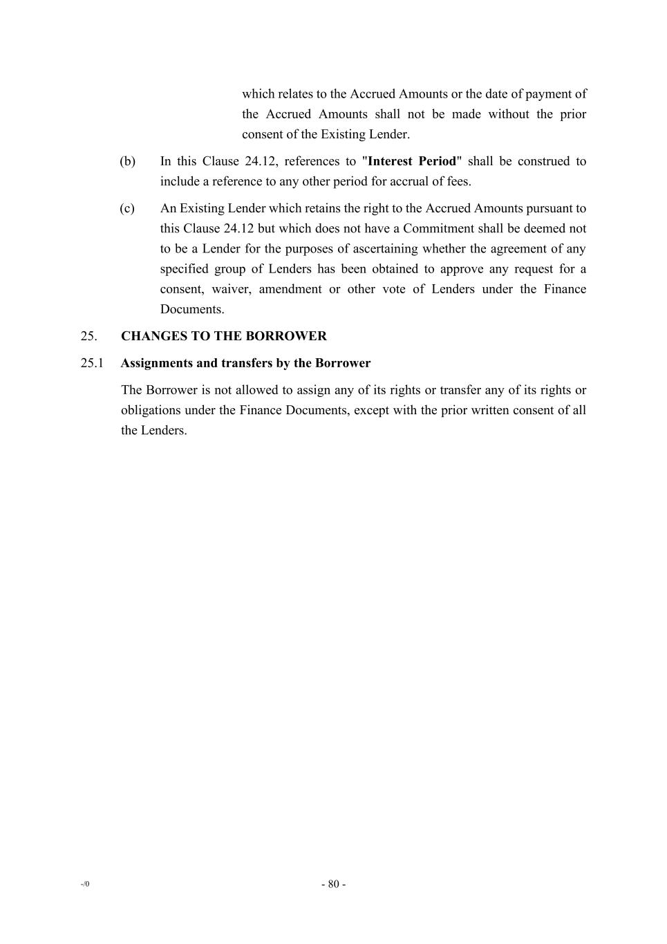 -/0 - 80 - which relates to the Accrued Amounts or the date of payment of the Accrued Amounts shall not be made without the prior consent of the Existing Lender. (b) In this Clause 24.12, references to "Interest Period" shall be construed to include a reference to any other period for accrual of fees. (c) An Existing Lender which retains the right to the Accrued Amounts pursuant to this Clause 24.12 but which does not have a Commitment shall be deemed not to be a Lender for the purposes of ascertaining whether the agreement of any specified group of Lenders has been obtained to approve any request for a consent, waiver, amendment or other vote of Lenders under the Finance Documents. 25. CHANGES TO THE BORROWER 25.1 Assignments and transfers by the Borrower The Borrower is not allowed to assign any of its rights or transfer any of its rights or obligations under the Finance Documents, except with the prior written consent of all the Lenders.