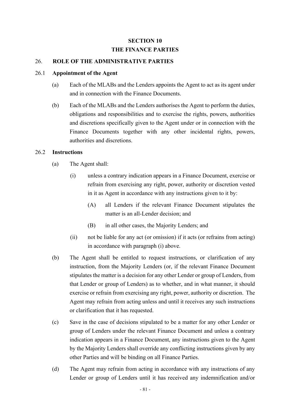 - 81 - SECTION 10 THE FINANCE PARTIES 26. ROLE OF THE ADMINISTRATIVE PARTIES 26.1 Appointment of the Agent (a) Each of the MLABs and the Lenders appoints the Agent to act as its agent under and in connection with the Finance Documents. (b) Each of the MLABs and the Lenders authorises the Agent to perform the duties, obligations and responsibilities and to exercise the rights, powers, authorities and discretions specifically given to the Agent under or in connection with the Finance Documents together with any other incidental rights, powers, authorities and discretions. 26.2 Instructions (a) The Agent shall: (i) unless a contrary indication appears in a Finance Document, exercise or refrain from exercising any right, power, authority or discretion vested in it as Agent in accordance with any instructions given to it by: (A) all Lenders if the relevant Finance Document stipulates the matter is an all-Lender decision; and (B) in all other cases, the Majority Lenders; and (ii) not be liable for any act (or omission) if it acts (or refrains from acting) in accordance with paragraph (i) above. (b) The Agent shall be entitled to request instructions, or clarification of any instruction, from the Majority Lenders (or, if the relevant Finance Document stipulates the matter is a decision for any other Lender or group of Lenders, from that Lender or group of Lenders) as to whether, and in what manner, it should exercise or refrain from exercising any right, power, authority or discretion. The Agent may refrain from acting unless and until it receives any such instructions or clarification that it has requested. (c) Save in the case of decisions stipulated to be a matter for any other Lender or group of Lenders under the relevant Finance Document and unless a contrary indication appears in a Finance Document, any instructions given to the Agent by the Majority Lenders shall override any conflicting instructions given by any other Parties and will be binding on all Finance Parties. (d) The Agent may refrain from acting in accordance with any instructions of any Lender or group of Lenders until it has received any indemnification and/or