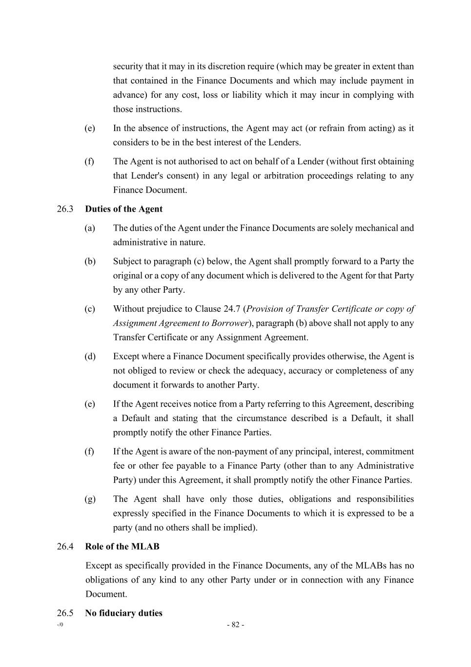 -/0 - 82 - security that it may in its discretion require (which may be greater in extent than that contained in the Finance Documents and which may include payment in advance) for any cost, loss or liability which it may incur in complying with those instructions. (e) In the absence of instructions, the Agent may act (or refrain from acting) as it considers to be in the best interest of the Lenders. (f) The Agent is not authorised to act on behalf of a Lender (without first obtaining that Lender's consent) in any legal or arbitration proceedings relating to any Finance Document. 26.3 Duties of the Agent (a) The duties of the Agent under the Finance Documents are solely mechanical and administrative in nature. (b) Subject to paragraph (c) below, the Agent shall promptly forward to a Party the original or a copy of any document which is delivered to the Agent for that Party by any other Party. (c) Without prejudice to Clause 24.7 (Provision of Transfer Certificate or copy of Assignment Agreement to Borrower), paragraph (b) above shall not apply to any Transfer Certificate or any Assignment Agreement. (d) Except where a Finance Document specifically provides otherwise, the Agent is not obliged to review or check the adequacy, accuracy or completeness of any document it forwards to another Party. (e) If the Agent receives notice from a Party referring to this Agreement, describing a Default and stating that the circumstance described is a Default, it shall promptly notify the other Finance Parties. (f) If the Agent is aware of the non-payment of any principal, interest, commitment fee or other fee payable to a Finance Party (other than to any Administrative Party) under this Agreement, it shall promptly notify the other Finance Parties. (g) The Agent shall have only those duties, obligations and responsibilities expressly specified in the Finance Documents to which it is expressed to be a party (and no others shall be implied). 26.4 Role of the MLAB Except as specifically provided in the Finance Documents, any of the MLABs has no obligations of any kind to any other Party under or in connection with any Finance Document. 26.5 No fiduciary duties