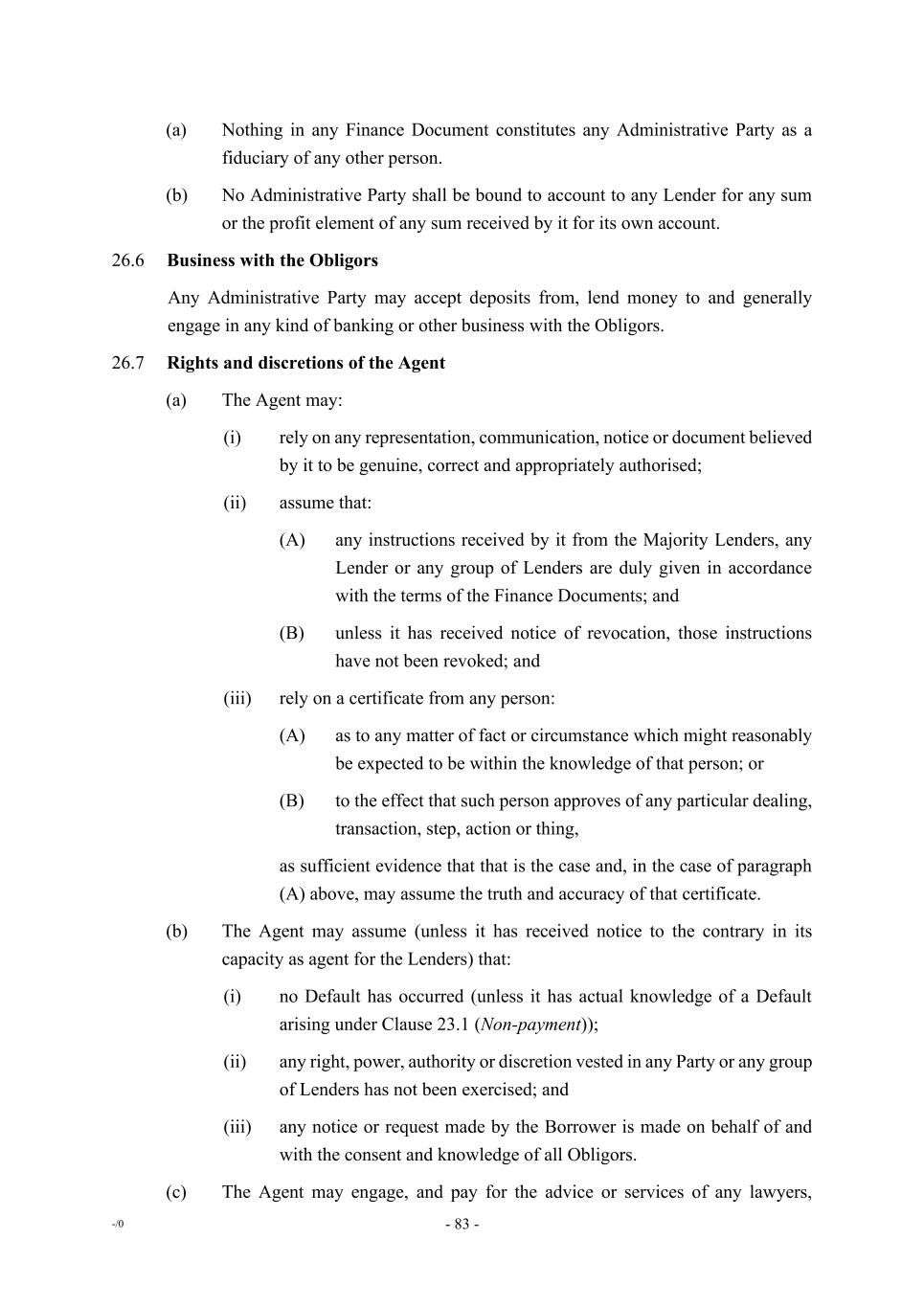 -/0 - 83 - (a) Nothing in any Finance Document constitutes any Administrative Party as a fiduciary of any other person. (b) No Administrative Party shall be bound to account to any Lender for any sum or the profit element of any sum received by it for its own account. 26.6 Business with the Obligors Any Administrative Party may accept deposits from, lend money to and generally engage in any kind of banking or other business with the Obligors. 26.7 Rights and discretions of the Agent (a) The Agent may: (i) rely on any representation, communication, notice or document believed by it to be genuine, correct and appropriately authorised; (ii) assume that: (A) any instructions received by it from the Majority Lenders, any Lender or any group of Lenders are duly given in accordance with the terms of the Finance Documents; and (B) unless it has received notice of revocation, those instructions have not been revoked; and (iii) rely on a certificate from any person: (A) as to any matter of fact or circumstance which might reasonably be expected to be within the knowledge of that person; or (B) to the effect that such person approves of any particular dealing, transaction, step, action or thing, as sufficient evidence that that is the case and, in the case of paragraph (A) above, may assume the truth and accuracy of that certificate. (b) The Agent may assume (unless it has received notice to the contrary in its capacity as agent for the Lenders) that: (i) no Default has occurred (unless it has actual knowledge of a Default arising under Clause 23.1 (Non-payment)); (ii) any right, power, authority or discretion vested in any Party or any group of Lenders has not been exercised; and (iii) any notice or request made by the Borrower is made on behalf of and with the consent and knowledge of all Obligors. (c) The Agent may engage, and pay for the advice or services of any lawyers,