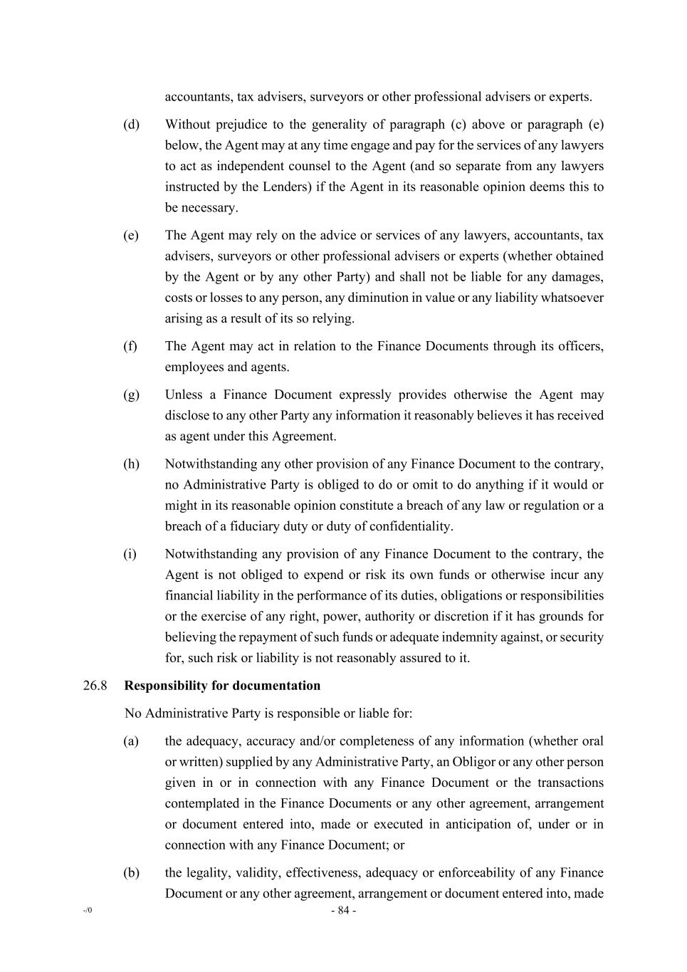 -/0 - 84 - accountants, tax advisers, surveyors or other professional advisers or experts. (d) Without prejudice to the generality of paragraph (c) above or paragraph (e) below, the Agent may at any time engage and pay for the services of any lawyers to act as independent counsel to the Agent (and so separate from any lawyers instructed by the Lenders) if the Agent in its reasonable opinion deems this to be necessary. (e) The Agent may rely on the advice or services of any lawyers, accountants, tax advisers, surveyors or other professional advisers or experts (whether obtained by the Agent or by any other Party) and shall not be liable for any damages, costs or losses to any person, any diminution in value or any liability whatsoever arising as a result of its so relying. (f) The Agent may act in relation to the Finance Documents through its officers, employees and agents. (g) Unless a Finance Document expressly provides otherwise the Agent may disclose to any other Party any information it reasonably believes it has received as agent under this Agreement. (h) Notwithstanding any other provision of any Finance Document to the contrary, no Administrative Party is obliged to do or omit to do anything if it would or might in its reasonable opinion constitute a breach of any law or regulation or a breach of a fiduciary duty or duty of confidentiality. (i) Notwithstanding any provision of any Finance Document to the contrary, the Agent is not obliged to expend or risk its own funds or otherwise incur any financial liability in the performance of its duties, obligations or responsibilities or the exercise of any right, power, authority or discretion if it has grounds for believing the repayment of such funds or adequate indemnity against, or security for, such risk or liability is not reasonably assured to it. 26.8 Responsibility for documentation No Administrative Party is responsible or liable for: (a) the adequacy, accuracy and/or completeness of any information (whether oral or written) supplied by any Administrative Party, an Obligor or any other person given in or in connection with any Finance Document or the transactions contemplated in the Finance Documents or any other agreement, arrangement or document entered into, made or executed in anticipation of, under or in connection with any Finance Document; or (b) the legality, validity, effectiveness, adequacy or enforceability of any Finance Document or any other agreement, arrangement or document entered into, made