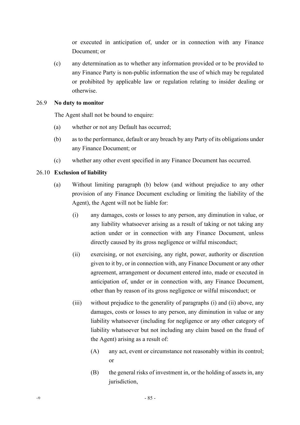 -/0 - 85 - or executed in anticipation of, under or in connection with any Finance Document; or (c) any determination as to whether any information provided or to be provided to any Finance Party is non-public information the use of which may be regulated or prohibited by applicable law or regulation relating to insider dealing or otherwise. 26.9 No duty to monitor The Agent shall not be bound to enquire: (a) whether or not any Default has occurred; (b) as to the performance, default or any breach by any Party of its obligations under any Finance Document; or (c) whether any other event specified in any Finance Document has occurred. 26.10 Exclusion of liability (a) Without limiting paragraph (b) below (and without prejudice to any other provision of any Finance Document excluding or limiting the liability of the Agent), the Agent will not be liable for: (i) any damages, costs or losses to any person, any diminution in value, or any liability whatsoever arising as a result of taking or not taking any action under or in connection with any Finance Document, unless directly caused by its gross negligence or wilful misconduct; (ii) exercising, or not exercising, any right, power, authority or discretion given to it by, or in connection with, any Finance Document or any other agreement, arrangement or document entered into, made or executed in anticipation of, under or in connection with, any Finance Document, other than by reason of its gross negligence or wilful misconduct; or (iii) without prejudice to the generality of paragraphs (i) and (ii) above, any damages, costs or losses to any person, any diminution in value or any liability whatsoever (including for negligence or any other category of liability whatsoever but not including any claim based on the fraud of the Agent) arising as a result of: (A) any act, event or circumstance not reasonably within its control; or (B) the general risks of investment in, or the holding of assets in, any jurisdiction,