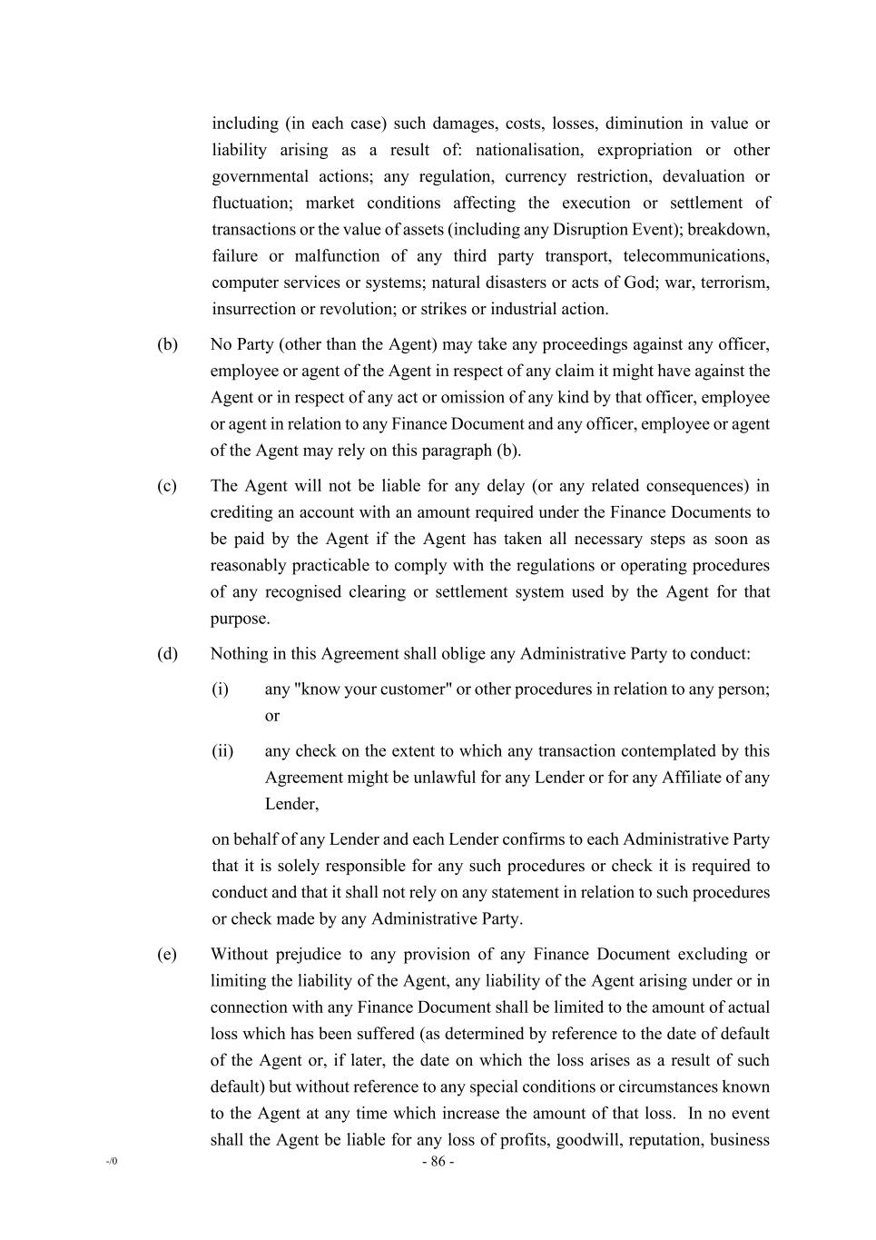 -/0 - 86 - including (in each case) such damages, costs, losses, diminution in value or liability arising as a result of: nationalisation, expropriation or other governmental actions; any regulation, currency restriction, devaluation or fluctuation; market conditions affecting the execution or settlement of transactions or the value of assets (including any Disruption Event); breakdown, failure or malfunction of any third party transport, telecommunications, computer services or systems; natural disasters or acts of God; war, terrorism, insurrection or revolution; or strikes or industrial action. (b) No Party (other than the Agent) may take any proceedings against any officer, employee or agent of the Agent in respect of any claim it might have against the Agent or in respect of any act or omission of any kind by that officer, employee or agent in relation to any Finance Document and any officer, employee or agent of the Agent may rely on this paragraph (b). (c) The Agent will not be liable for any delay (or any related consequences) in crediting an account with an amount required under the Finance Documents to be paid by the Agent if the Agent has taken all necessary steps as soon as reasonably practicable to comply with the regulations or operating procedures of any recognised clearing or settlement system used by the Agent for that purpose. (d) Nothing in this Agreement shall oblige any Administrative Party to conduct: (i) any "know your customer" or other procedures in relation to any person; or (ii) any check on the extent to which any transaction contemplated by this Agreement might be unlawful for any Lender or for any Affiliate of any Lender, on behalf of any Lender and each Lender confirms to each Administrative Party that it is solely responsible for any such procedures or check it is required to conduct and that it shall not rely on any statement in relation to such procedures or check made by any Administrative Party. (e) Without prejudice to any provision of any Finance Document excluding or limiting the liability of the Agent, any liability of the Agent arising under or in connection with any Finance Document shall be limited to the amount of actual loss which has been suffered (as determined by reference to the date of default of the Agent or, if later, the date on which the loss arises as a result of such default) but without reference to any special conditions or circumstances known to the Agent at any time which increase the amount of that loss. In no event shall the Agent be liable for any loss of profits, goodwill, reputation, business