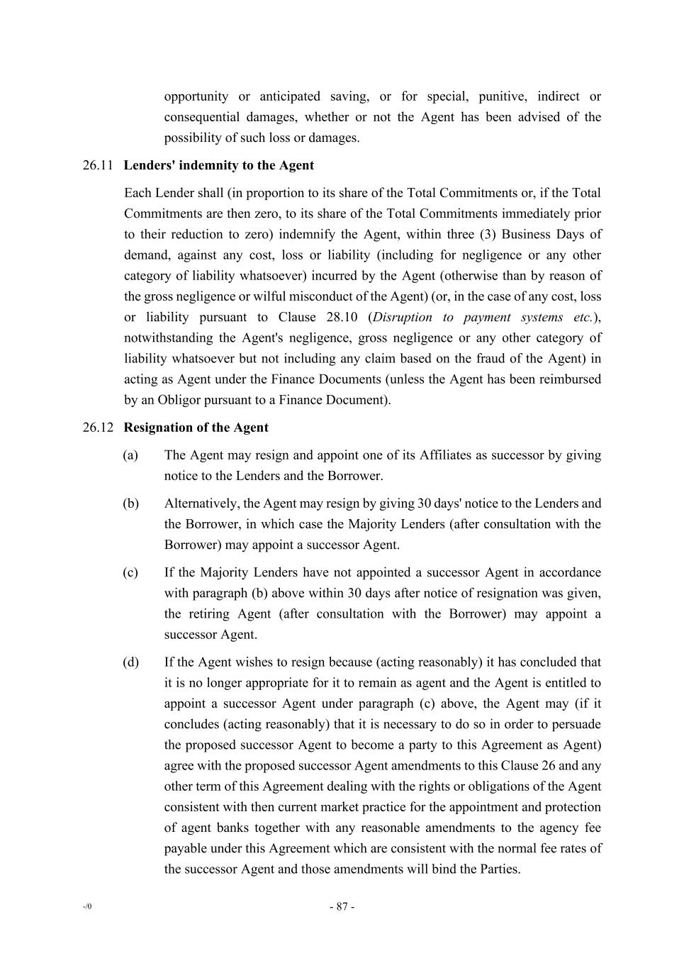 -/0 - 87 - opportunity or anticipated saving, or for special, punitive, indirect or consequential damages, whether or not the Agent has been advised of the possibility of such loss or damages. 26.11 Lenders' indemnity to the Agent Each Lender shall (in proportion to its share of the Total Commitments or, if the Total Commitments are then zero, to its share of the Total Commitments immediately prior to their reduction to zero) indemnify the Agent, within three (3) Business Days of demand, against any cost, loss or liability (including for negligence or any other category of liability whatsoever) incurred by the Agent (otherwise than by reason of the gross negligence or wilful misconduct of the Agent) (or, in the case of any cost, loss or liability pursuant to Clause 28.10 (Disruption to payment systems etc.), notwithstanding the Agent's negligence, gross negligence or any other category of liability whatsoever but not including any claim based on the fraud of the Agent) in acting as Agent under the Finance Documents (unless the Agent has been reimbursed by an Obligor pursuant to a Finance Document). 26.12 Resignation of the Agent (a) The Agent may resign and appoint one of its Affiliates as successor by giving notice to the Lenders and the Borrower. (b) Alternatively, the Agent may resign by giving 30 days' notice to the Lenders and the Borrower, in which case the Majority Lenders (after consultation with the Borrower) may appoint a successor Agent. (c) If the Majority Lenders have not appointed a successor Agent in accordance with paragraph (b) above within 30 days after notice of resignation was given, the retiring Agent (after consultation with the Borrower) may appoint a successor Agent. (d) If the Agent wishes to resign because (acting reasonably) it has concluded that it is no longer appropriate for it to remain as agent and the Agent is entitled to appoint a successor Agent under paragraph (c) above, the Agent may (if it concludes (acting reasonably) that it is necessary to do so in order to persuade the proposed successor Agent to become a party to this Agreement as Agent) agree with the proposed successor Agent amendments to this Clause 26 and any other term of this Agreement dealing with the rights or obligations of the Agent consistent with then current market practice for the appointment and protection of agent banks together with any reasonable amendments to the agency fee payable under this Agreement which are consistent with the normal fee rates of the successor Agent and those amendments will bind the Parties.