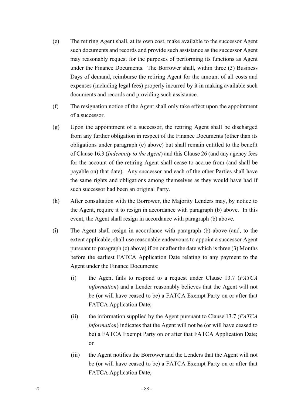 -/0 - 88 - (e) The retiring Agent shall, at its own cost, make available to the successor Agent such documents and records and provide such assistance as the successor Agent may reasonably request for the purposes of performing its functions as Agent under the Finance Documents. The Borrower shall, within three (3) Business Days of demand, reimburse the retiring Agent for the amount of all costs and expenses (including legal fees) properly incurred by it in making available such documents and records and providing such assistance. (f) The resignation notice of the Agent shall only take effect upon the appointment of a successor. (g) Upon the appointment of a successor, the retiring Agent shall be discharged from any further obligation in respect of the Finance Documents (other than its obligations under paragraph (e) above) but shall remain entitled to the benefit of Clause 16.3 (Indemnity to the Agent) and this Clause 26 (and any agency fees for the account of the retiring Agent shall cease to accrue from (and shall be payable on) that date). Any successor and each of the other Parties shall have the same rights and obligations among themselves as they would have had if such successor had been an original Party. (h) After consultation with the Borrower, the Majority Lenders may, by notice to the Agent, require it to resign in accordance with paragraph (b) above. In this event, the Agent shall resign in accordance with paragraph (b) above. (i) The Agent shall resign in accordance with paragraph (b) above (and, to the extent applicable, shall use reasonable endeavours to appoint a successor Agent pursuant to paragraph (c) above) if on or after the date which is three (3) Months before the earliest FATCA Application Date relating to any payment to the Agent under the Finance Documents: (i) the Agent fails to respond to a request under Clause 13.7 (FATCA information) and a Lender reasonably believes that the Agent will not be (or will have ceased to be) a FATCA Exempt Party on or after that FATCA Application Date; (ii) the information supplied by the Agent pursuant to Clause 13.7 (FATCA information) indicates that the Agent will not be (or will have ceased to be) a FATCA Exempt Party on or after that FATCA Application Date; or (iii) the Agent notifies the Borrower and the Lenders that the Agent will not be (or will have ceased to be) a FATCA Exempt Party on or after that FATCA Application Date,