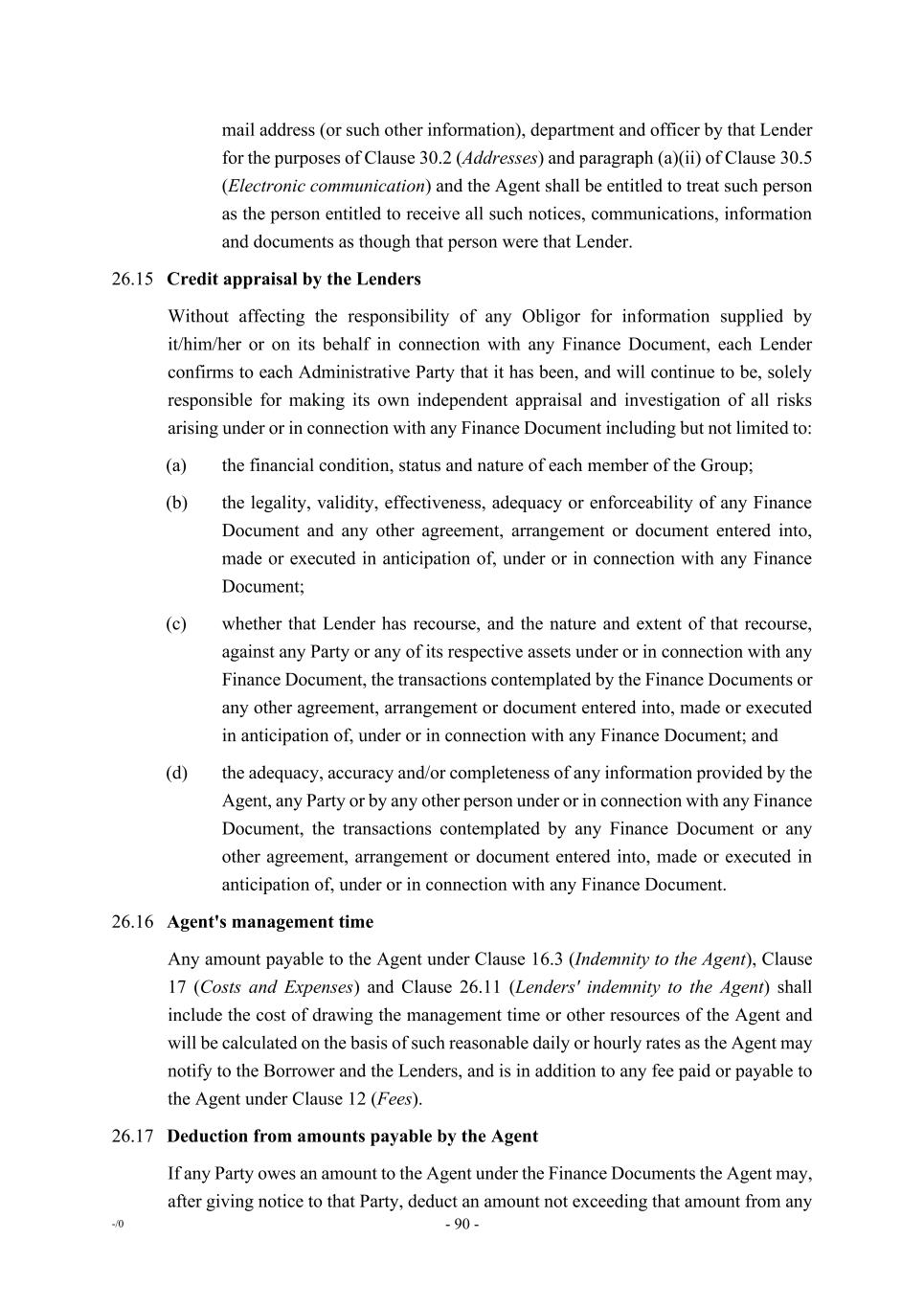-/0 - 90 - mail address (or such other information), department and officer by that Lender for the purposes of Clause 30.2 (Addresses) and paragraph (a)(ii) of Clause 30.5 (Electronic communication) and the Agent shall be entitled to treat such person as the person entitled to receive all such notices, communications, information and documents as though that person were that Lender. 26.15 Credit appraisal by the Lenders Without affecting the responsibility of any Obligor for information supplied by it/him/her or on its behalf in connection with any Finance Document, each Lender confirms to each Administrative Party that it has been, and will continue to be, solely responsible for making its own independent appraisal and investigation of all risks arising under or in connection with any Finance Document including but not limited to: (a) the financial condition, status and nature of each member of the Group; (b) the legality, validity, effectiveness, adequacy or enforceability of any Finance Document and any other agreement, arrangement or document entered into, made or executed in anticipation of, under or in connection with any Finance Document; (c) whether that Lender has recourse, and the nature and extent of that recourse, against any Party or any of its respective assets under or in connection with any Finance Document, the transactions contemplated by the Finance Documents or any other agreement, arrangement or document entered into, made or executed in anticipation of, under or in connection with any Finance Document; and (d) the adequacy, accuracy and/or completeness of any information provided by the Agent, any Party or by any other person under or in connection with any Finance Document, the transactions contemplated by any Finance Document or any other agreement, arrangement or document entered into, made or executed in anticipation of, under or in connection with any Finance Document. 26.16 Agent's management time Any amount payable to the Agent under Clause 16.3 (Indemnity to the Agent), Clause 17 (Costs and Expenses) and Clause 26.11 (Lenders' indemnity to the Agent) shall include the cost of drawing the management time or other resources of the Agent and will be calculated on the basis of such reasonable daily or hourly rates as the Agent may notify to the Borrower and the Lenders, and is in addition to any fee paid or payable to the Agent under Clause 12 (Fees). 26.17 Deduction from amounts payable by the Agent If any Party owes an amount to the Agent under the Finance Documents the Agent may, after giving notice to that Party, deduct an amount not exceeding that amount from any