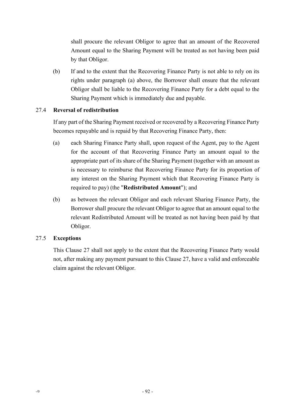 -/0 - 92 - shall procure the relevant Obligor to agree that an amount of the Recovered Amount equal to the Sharing Payment will be treated as not having been paid by that Obligor. (b) If and to the extent that the Recovering Finance Party is not able to rely on its rights under paragraph (a) above, the Borrower shall ensure that the relevant Obligor shall be liable to the Recovering Finance Party for a debt equal to the Sharing Payment which is immediately due and payable. 27.4 Reversal of redistribution If any part of the Sharing Payment received or recovered by a Recovering Finance Party becomes repayable and is repaid by that Recovering Finance Party, then: (a) each Sharing Finance Party shall, upon request of the Agent, pay to the Agent for the account of that Recovering Finance Party an amount equal to the appropriate part of its share of the Sharing Payment (together with an amount as is necessary to reimburse that Recovering Finance Party for its proportion of any interest on the Sharing Payment which that Recovering Finance Party is required to pay) (the "Redistributed Amount"); and (b) as between the relevant Obligor and each relevant Sharing Finance Party, the Borrower shall procure the relevant Obligor to agree that an amount equal to the relevant Redistributed Amount will be treated as not having been paid by that Obligor. 27.5 Exceptions This Clause 27 shall not apply to the extent that the Recovering Finance Party would not, after making any payment pursuant to this Clause 27, have a valid and enforceable claim against the relevant Obligor.
