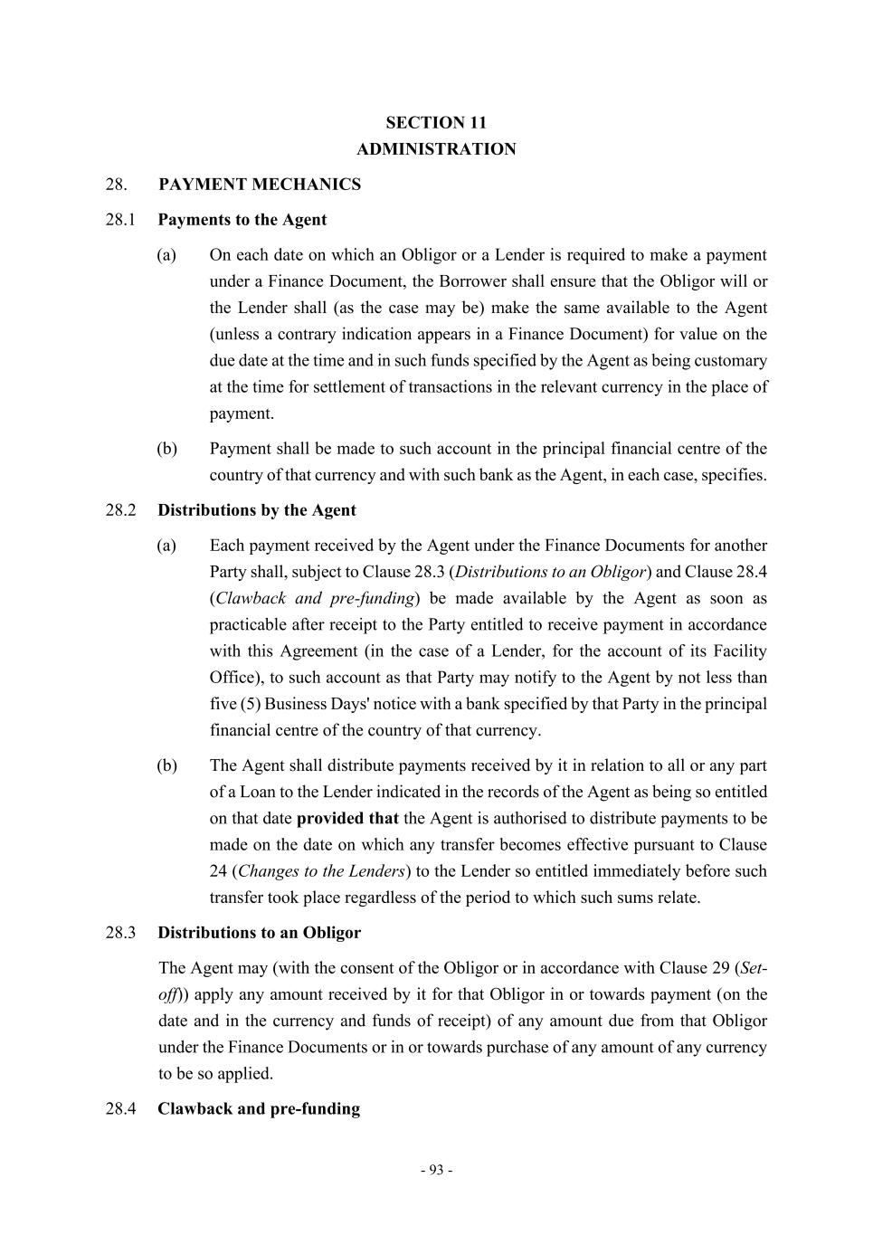 - 93 - SECTION 11 ADMINISTRATION 28. PAYMENT MECHANICS 28.1 Payments to the Agent (a) On each date on which an Obligor or a Lender is required to make a payment under a Finance Document, the Borrower shall ensure that the Obligor will or the Lender shall (as the case may be) make the same available to the Agent (unless a contrary indication appears in a Finance Document) for value on the due date at the time and in such funds specified by the Agent as being customary at the time for settlement of transactions in the relevant currency in the place of payment. (b) Payment shall be made to such account in the principal financial centre of the country of that currency and with such bank as the Agent, in each case, specifies. 28.2 Distributions by the Agent (a) Each payment received by the Agent under the Finance Documents for another Party shall, subject to Clause 28.3 (Distributions to an Obligor) and Clause 28.4 (Clawback and pre-funding) be made available by the Agent as soon as practicable after receipt to the Party entitled to receive payment in accordance with this Agreement (in the case of a Lender, for the account of its Facility Office), to such account as that Party may notify to the Agent by not less than five (5) Business Days' notice with a bank specified by that Party in the principal financial centre of the country of that currency. (b) The Agent shall distribute payments received by it in relation to all or any part of a Loan to the Lender indicated in the records of the Agent as being so entitled on that date provided that the Agent is authorised to distribute payments to be made on the date on which any transfer becomes effective pursuant to Clause 24 (Changes to the Lenders) to the Lender so entitled immediately before such transfer took place regardless of the period to which such sums relate. 28.3 Distributions to an Obligor The Agent may (with the consent of the Obligor or in accordance with Clause 29 (Set- off)) apply any amount received by it for that Obligor in or towards payment (on the date and in the currency and funds of receipt) of any amount due from that Obligor under the Finance Documents or in or towards purchase of any amount of any currency to be so applied. 28.4 Clawback and pre-funding