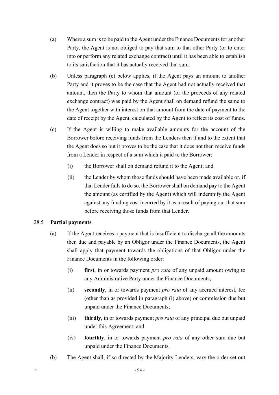 -/0 - 94 - (a) Where a sum is to be paid to the Agent under the Finance Documents for another Party, the Agent is not obliged to pay that sum to that other Party (or to enter into or perform any related exchange contract) until it has been able to establish to its satisfaction that it has actually received that sum. (b) Unless paragraph (c) below applies, if the Agent pays an amount to another Party and it proves to be the case that the Agent had not actually received that amount, then the Party to whom that amount (or the proceeds of any related exchange contract) was paid by the Agent shall on demand refund the same to the Agent together with interest on that amount from the date of payment to the date of receipt by the Agent, calculated by the Agent to reflect its cost of funds. (c) If the Agent is willing to make available amounts for the account of the Borrower before receiving funds from the Lenders then if and to the extent that the Agent does so but it proves to be the case that it does not then receive funds from a Lender in respect of a sum which it paid to the Borrower: (i) the Borrower shall on demand refund it to the Agent; and (ii) the Lender by whom those funds should have been made available or, if that Lender fails to do so, the Borrower shall on demand pay to the Agent the amount (as certified by the Agent) which will indemnify the Agent against any funding cost incurred by it as a result of paying out that sum before receiving those funds from that Lender. 28.5 Partial payments (a) If the Agent receives a payment that is insufficient to discharge all the amounts then due and payable by an Obligor under the Finance Documents, the Agent shall apply that payment towards the obligations of that Obligor under the Finance Documents in the following order: (i) first, in or towards payment pro rata of any unpaid amount owing to any Administrative Party under the Finance Documents; (ii) secondly, in or towards payment pro rata of any accrued interest, fee (other than as provided in paragraph (i) above) or commission due but unpaid under the Finance Documents; (iii) thirdly, in or towards payment pro rata of any principal due but unpaid under this Agreement; and (iv) fourthly, in or towards payment pro rata of any other sum due but unpaid under the Finance Documents. (b) The Agent shall, if so directed by the Majority Lenders, vary the order set out