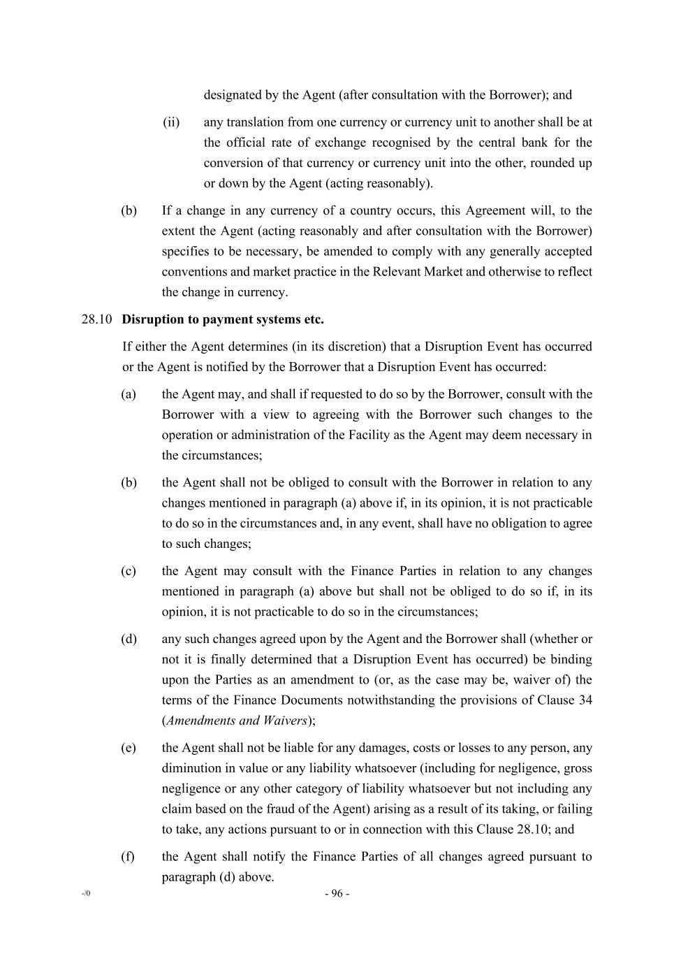 -/0 - 96 - designated by the Agent (after consultation with the Borrower); and (ii) any translation from one currency or currency unit to another shall be at the official rate of exchange recognised by the central bank for the conversion of that currency or currency unit into the other, rounded up or down by the Agent (acting reasonably). (b) If a change in any currency of a country occurs, this Agreement will, to the extent the Agent (acting reasonably and after consultation with the Borrower) specifies to be necessary, be amended to comply with any generally accepted conventions and market practice in the Relevant Market and otherwise to reflect the change in currency. 28.10 Disruption to payment systems etc. If either the Agent determines (in its discretion) that a Disruption Event has occurred or the Agent is notified by the Borrower that a Disruption Event has occurred: (a) the Agent may, and shall if requested to do so by the Borrower, consult with the Borrower with a view to agreeing with the Borrower such changes to the operation or administration of the Facility as the Agent may deem necessary in the circumstances; (b) the Agent shall not be obliged to consult with the Borrower in relation to any changes mentioned in paragraph (a) above if, in its opinion, it is not practicable to do so in the circumstances and, in any event, shall have no obligation to agree to such changes; (c) the Agent may consult with the Finance Parties in relation to any changes mentioned in paragraph (a) above but shall not be obliged to do so if, in its opinion, it is not practicable to do so in the circumstances; (d) any such changes agreed upon by the Agent and the Borrower shall (whether or not it is finally determined that a Disruption Event has occurred) be binding upon the Parties as an amendment to (or, as the case may be, waiver of) the terms of the Finance Documents notwithstanding the provisions of Clause 34 (Amendments and Waivers); (e) the Agent shall not be liable for any damages, costs or losses to any person, any diminution in value or any liability whatsoever (including for negligence, gross negligence or any other category of liability whatsoever but not including any claim based on the fraud of the Agent) arising as a result of its taking, or failing to take, any actions pursuant to or in connection with this Clause 28.10; and (f) the Agent shall notify the Finance Parties of all changes agreed pursuant to paragraph (d) above.