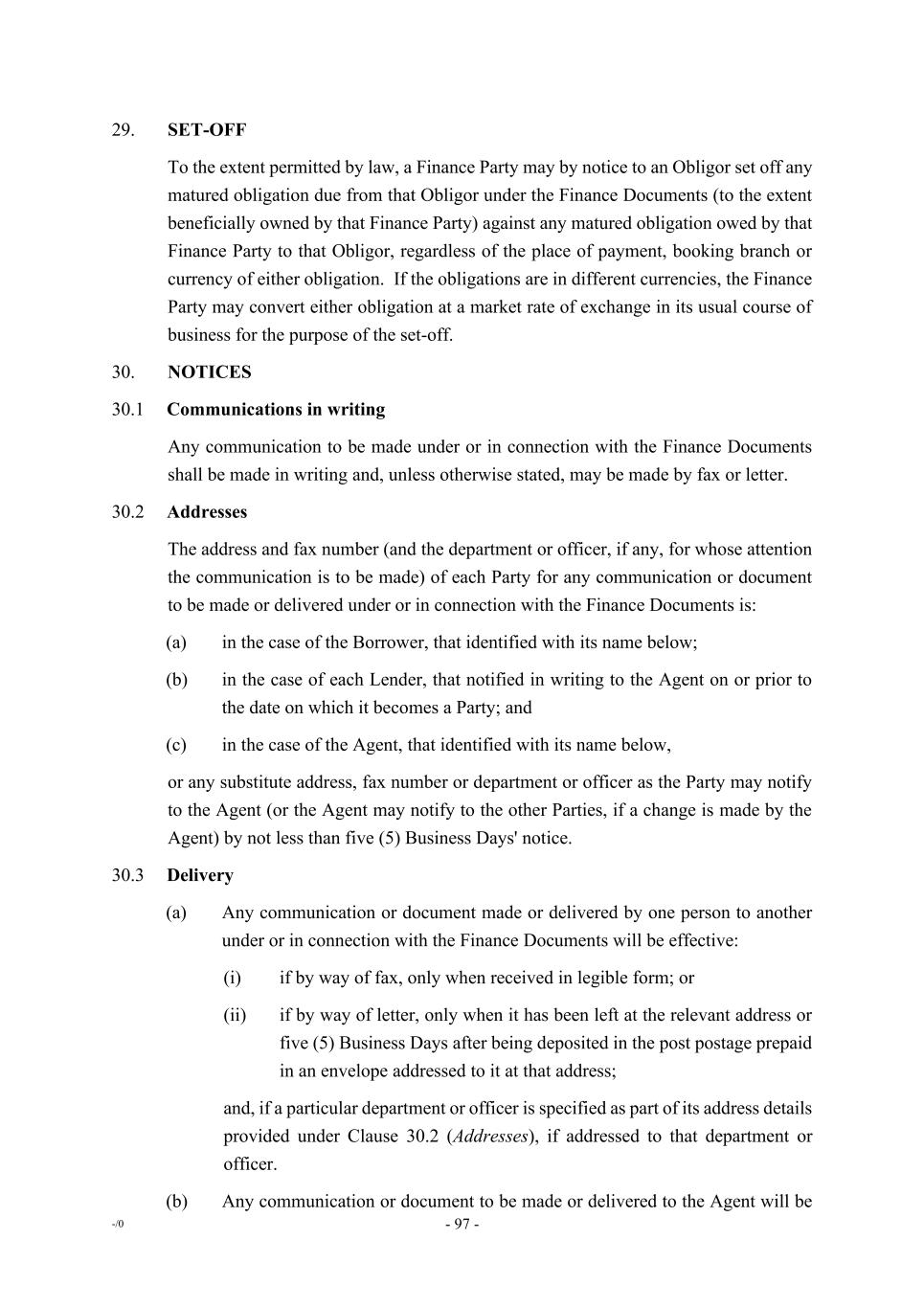 -/0 - 97 - 29. SET-OFF To the extent permitted by law, a Finance Party may by notice to an Obligor set off any matured obligation due from that Obligor under the Finance Documents (to the extent beneficially owned by that Finance Party) against any matured obligation owed by that Finance Party to that Obligor, regardless of the place of payment, booking branch or currency of either obligation. If the obligations are in different currencies, the Finance Party may convert either obligation at a market rate of exchange in its usual course of business for the purpose of the set-off. 30. NOTICES 30.1 Communications in writing Any communication to be made under or in connection with the Finance Documents shall be made in writing and, unless otherwise stated, may be made by fax or letter. 30.2 Addresses The address and fax number (and the department or officer, if any, for whose attention the communication is to be made) of each Party for any communication or document to be made or delivered under or in connection with the Finance Documents is: (a) in the case of the Borrower, that identified with its name below; (b) in the case of each Lender, that notified in writing to the Agent on or prior to the date on which it becomes a Party; and (c) in the case of the Agent, that identified with its name below, or any substitute address, fax number or department or officer as the Party may notify to the Agent (or the Agent may notify to the other Parties, if a change is made by the Agent) by not less than five (5) Business Days' notice. 30.3 Delivery (a) Any communication or document made or delivered by one person to another under or in connection with the Finance Documents will be effective: (i) if by way of fax, only when received in legible form; or (ii) if by way of letter, only when it has been left at the relevant address or five (5) Business Days after being deposited in the post postage prepaid in an envelope addressed to it at that address; and, if a particular department or officer is specified as part of its address details provided under Clause 30.2 (Addresses), if addressed to that department or officer. (b) Any communication or document to be made or delivered to the Agent will be