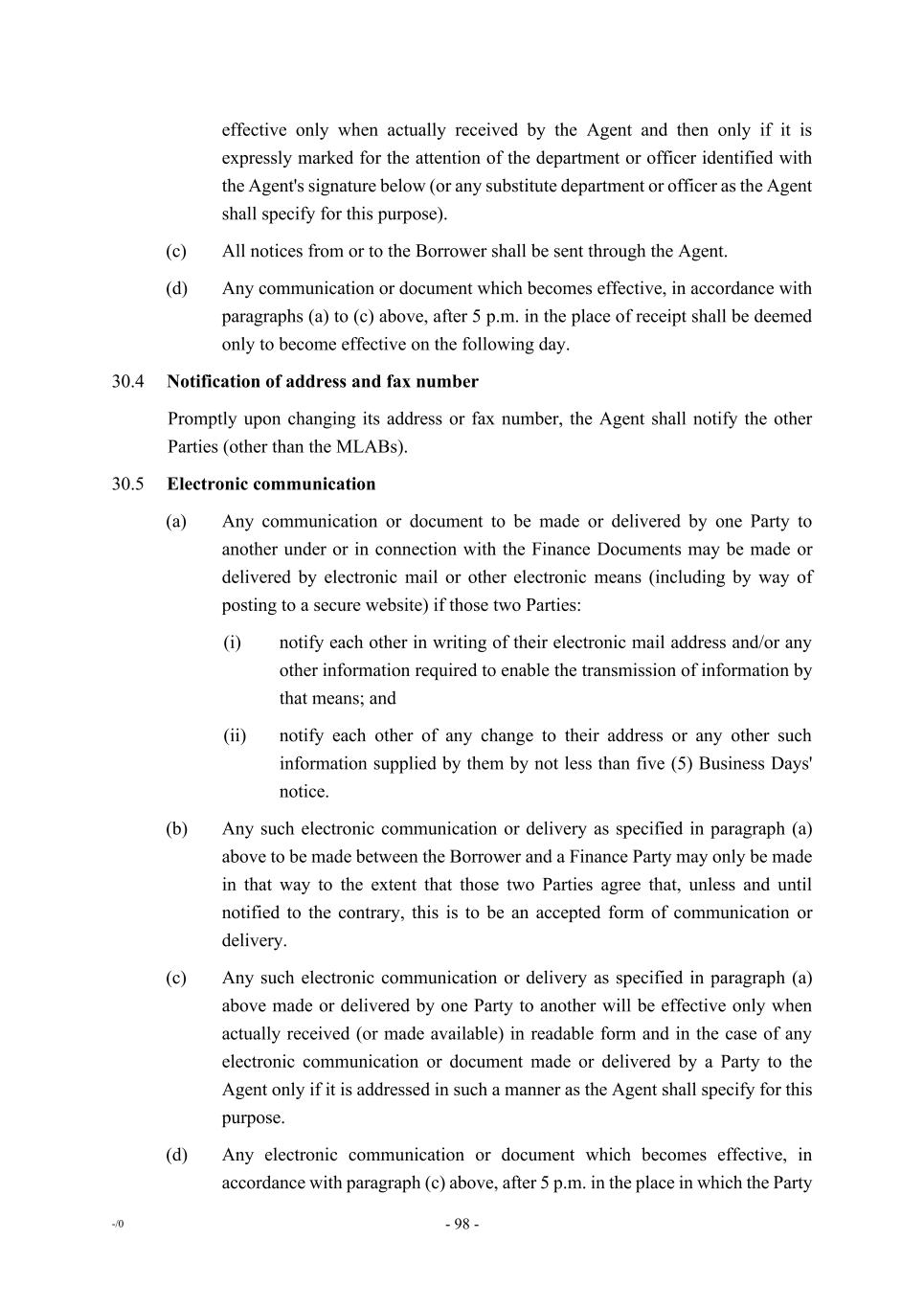 -/0 - 98 - effective only when actually received by the Agent and then only if it is expressly marked for the attention of the department or officer identified with the Agent's signature below (or any substitute department or officer as the Agent shall specify for this purpose). (c) All notices from or to the Borrower shall be sent through the Agent. (d) Any communication or document which becomes effective, in accordance with paragraphs (a) to (c) above, after 5 p.m. in the place of receipt shall be deemed only to become effective on the following day. 30.4 Notification of address and fax number Promptly upon changing its address or fax number, the Agent shall notify the other Parties (other than the MLABs). 30.5 Electronic communication (a) Any communication or document to be made or delivered by one Party to another under or in connection with the Finance Documents may be made or delivered by electronic mail or other electronic means (including by way of posting to a secure website) if those two Parties: (i) notify each other in writing of their electronic mail address and/or any other information required to enable the transmission of information by that means; and (ii) notify each other of any change to their address or any other such information supplied by them by not less than five (5) Business Days' notice. (b) Any such electronic communication or delivery as specified in paragraph (a) above to be made between the Borrower and a Finance Party may only be made in that way to the extent that those two Parties agree that, unless and until notified to the contrary, this is to be an accepted form of communication or delivery. (c) Any such electronic communication or delivery as specified in paragraph (a) above made or delivered by one Party to another will be effective only when actually received (or made available) in readable form and in the case of any electronic communication or document made or delivered by a Party to the Agent only if it is addressed in such a manner as the Agent shall specify for this purpose. (d) Any electronic communication or document which becomes effective, in accordance with paragraph (c) above, after 5 p.m. in the place in which the Party