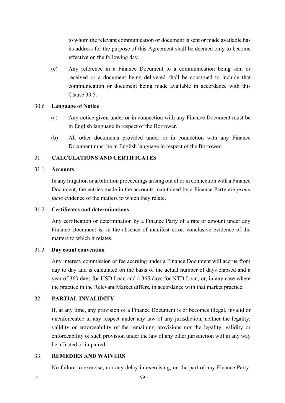 -/0 - 99 - to whom the relevant communication or document is sent or made available has its address for the purpose of this Agreement shall be deemed only to become effective on the following day. (e) Any reference in a Finance Document to a communication being sent or received or a document being delivered shall be construed to include that communication or document being made available in accordance with this Clause 30.5. 30.6 Language of Notice (a) Any notice given under or in connection with any Finance Document must be in English language in respect of the Borrower. (b) All other documents provided under or in connection with any Finance Document must be in English language in respect of the Borrower. 31. CALCULATIONS AND CERTIFICATES 31.1 Accounts In any litigation or arbitration proceedings arising out of or in connection with a Finance Document, the entries made in the accounts maintained by a Finance Party are prima facie evidence of the matters to which they relate. 31.2 Certificates and determinations Any certification or determination by a Finance Party of a rate or amount under any Finance Document is, in the absence of manifest error, conclusive evidence of the matters to which it relates. 31.3 Day count convention Any interest, commission or fee accruing under a Finance Document will accrue from day to day and is calculated on the basis of the actual number of days elapsed and a year of 360 days for USD Loan and a 365 days for NTD Loan, or, in any case where the practice in the Relevant Market differs, in accordance with that market practice. 32. PARTIAL INVALIDITY If, at any time, any provision of a Finance Document is or becomes illegal, invalid or unenforceable in any respect under any law of any jurisdiction, neither the legality, validity or enforceability of the remaining provisions nor the legality, validity or enforceability of such provision under the law of any other jurisdiction will in any way be affected or impaired. 33. REMEDIES AND WAIVERS No failure to exercise, nor any delay in exercising, on the part of any Finance Party,