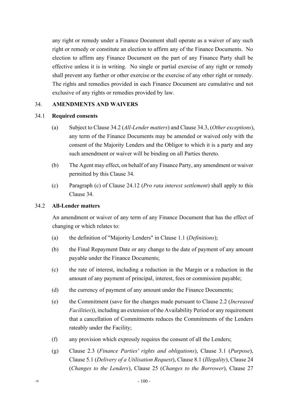 -/0 - 100 - any right or remedy under a Finance Document shall operate as a waiver of any such right or remedy or constitute an election to affirm any of the Finance Documents. No election to affirm any Finance Document on the part of any Finance Party shall be effective unless it is in writing. No single or partial exercise of any right or remedy shall prevent any further or other exercise or the exercise of any other right or remedy. The rights and remedies provided in each Finance Document are cumulative and not exclusive of any rights or remedies provided by law. 34. AMENDMENTS AND WAIVERS 34.1 Required consents (a) Subject to Clause 34.2 (All-Lender matters) and Clause 34.3, (Other exceptions), any term of the Finance Documents may be amended or waived only with the consent of the Majority Lenders and the Obligor to which it is a party and any such amendment or waiver will be binding on all Parties thereto. (b) The Agent may effect, on behalf of any Finance Party, any amendment or waiver permitted by this Clause 34. (c) Paragraph (c) of Clause 24.12 (Pro rata interest settlement) shall apply to this Clause 34. 34.2 All-Lender matters An amendment or waiver of any term of any Finance Document that has the effect of changing or which relates to: (a) the definition of "Majority Lenders" in Clause 1.1 (Definitions); (b) the Final Repayment Date or any change to the date of payment of any amount payable under the Finance Documents; (c) the rate of interest, including a reduction in the Margin or a reduction in the amount of any payment of principal, interest, fees or commission payable; (d) the currency of payment of any amount under the Finance Documents; (e) the Commitment (save for the changes made pursuant to Clause 2.2 (Increased Facilities)), including an extension of the Availability Period or any requirement that a cancellation of Commitments reduces the Commitments of the Lenders rateably under the Facility; (f) any provision which expressly requires the consent of all the Lenders; (g) Clause 2.3 (Finance Parties' rights and obligations), Clause 3.1 (Purpose), Clause 5.1 (Delivery of a Utilisation Request), Clause 8.1 (Illegality), Clause 24 (Changes to the Lenders), Clause 25 (Changes to the Borrower), Clause 27