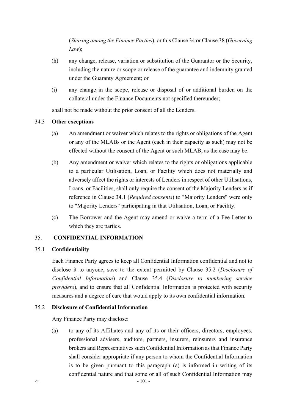 -/0 - 101 - (Sharing among the Finance Parties), or this Clause 34 or Clause 38 (Governing Law); (h) any change, release, variation or substitution of the Guarantor or the Security, including the nature or scope or release of the guarantee and indemnity granted under the Guaranty Agreement; or (i) any change in the scope, release or disposal of or additional burden on the collateral under the Finance Documents not specified thereunder; shall not be made without the prior consent of all the Lenders. 34.3 Other exceptions (a) An amendment or waiver which relates to the rights or obligations of the Agent or any of the MLABs or the Agent (each in their capacity as such) may not be effected without the consent of the Agent or such MLAB, as the case may be. (b) Any amendment or waiver which relates to the rights or obligations applicable to a particular Utilisation, Loan, or Facility which does not materially and adversely affect the rights or interests of Lenders in respect of other Utilisations, Loans, or Facilities, shall only require the consent of the Majority Lenders as if reference in Clause 34.1 (Required consents) to "Majority Lenders" were only to "Majority Lenders" participating in that Utilisation, Loan, or Facility. (c) The Borrower and the Agent may amend or waive a term of a Fee Letter to which they are parties. 35. CONFIDENTIAL INFORMATION 35.1 Confidentiality Each Finance Party agrees to keep all Confidential Information confidential and not to disclose it to anyone, save to the extent permitted by Clause 35.2 (Disclosure of Confidential Information) and Clause 35.4 (Disclosure to numbering service providers), and to ensure that all Confidential Information is protected with security measures and a degree of care that would apply to its own confidential information. 35.2 Disclosure of Confidential Information Any Finance Party may disclose: (a) to any of its Affiliates and any of its or their officers, directors, employees, professional advisers, auditors, partners, insurers, reinsurers and insurance brokers and Representatives such Confidential Information as that Finance Party shall consider appropriate if any person to whom the Confidential Information is to be given pursuant to this paragraph (a) is informed in writing of its confidential nature and that some or all of such Confidential Information may