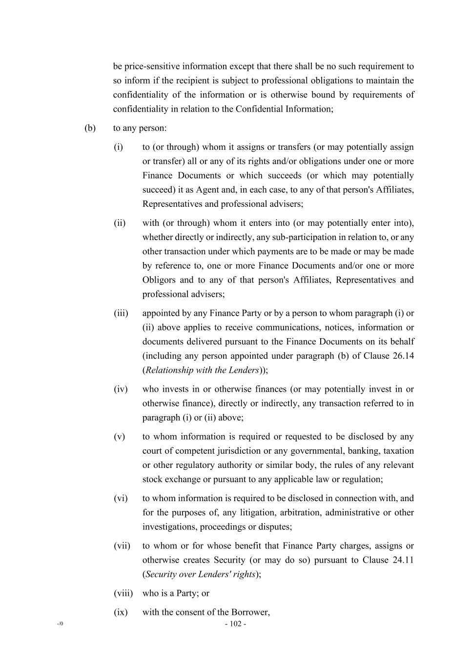 -/0 - 102 - be price-sensitive information except that there shall be no such requirement to so inform if the recipient is subject to professional obligations to maintain the confidentiality of the information or is otherwise bound by requirements of confidentiality in relation to the Confidential Information; (b) to any person: (i) to (or through) whom it assigns or transfers (or may potentially assign or transfer) all or any of its rights and/or obligations under one or more Finance Documents or which succeeds (or which may potentially succeed) it as Agent and, in each case, to any of that person's Affiliates, Representatives and professional advisers; (ii) with (or through) whom it enters into (or may potentially enter into), whether directly or indirectly, any sub-participation in relation to, or any other transaction under which payments are to be made or may be made by reference to, one or more Finance Documents and/or one or more Obligors and to any of that person's Affiliates, Representatives and professional advisers; (iii) appointed by any Finance Party or by a person to whom paragraph (i) or (ii) above applies to receive communications, notices, information or documents delivered pursuant to the Finance Documents on its behalf (including any person appointed under paragraph (b) of Clause 26.14 (Relationship with the Lenders)); (iv) who invests in or otherwise finances (or may potentially invest in or otherwise finance), directly or indirectly, any transaction referred to in paragraph (i) or (ii) above; (v) to whom information is required or requested to be disclosed by any court of competent jurisdiction or any governmental, banking, taxation or other regulatory authority or similar body, the rules of any relevant stock exchange or pursuant to any applicable law or regulation; (vi) to whom information is required to be disclosed in connection with, and for the purposes of, any litigation, arbitration, administrative or other investigations, proceedings or disputes; (vii) to whom or for whose benefit that Finance Party charges, assigns or otherwise creates Security (or may do so) pursuant to Clause 24.11 (Security over Lenders' rights); (viii) who is a Party; or (ix) with the consent of the Borrower,