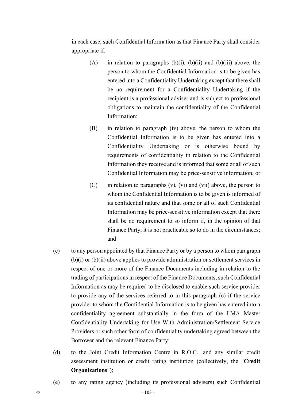 -/0 - 103 - in each case, such Confidential Information as that Finance Party shall consider appropriate if: (A) in relation to paragraphs (b)(i), (b)(ii) and (b)(iii) above, the person to whom the Confidential Information is to be given has entered into a Confidentiality Undertaking except that there shall be no requirement for a Confidentiality Undertaking if the recipient is a professional adviser and is subject to professional obligations to maintain the confidentiality of the Confidential Information; (B) in relation to paragraph (iv) above, the person to whom the Confidential Information is to be given has entered into a Confidentiality Undertaking or is otherwise bound by requirements of confidentiality in relation to the Confidential Information they receive and is informed that some or all of such Confidential Information may be price-sensitive information; or (C) in relation to paragraphs (v), (vi) and (vii) above, the person to whom the Confidential Information is to be given is informed of its confidential nature and that some or all of such Confidential Information may be price-sensitive information except that there shall be no requirement to so inform if, in the opinion of that Finance Party, it is not practicable so to do in the circumstances; and (c) to any person appointed by that Finance Party or by a person to whom paragraph (b)(i) or (b)(ii) above applies to provide administration or settlement services in respect of one or more of the Finance Documents including in relation to the trading of participations in respect of the Finance Documents, such Confidential Information as may be required to be disclosed to enable such service provider to provide any of the services referred to in this paragraph (c) if the service provider to whom the Confidential Information is to be given has entered into a confidentiality agreement substantially in the form of the LMA Master Confidentiality Undertaking for Use With Administration/Settlement Service Providers or such other form of confidentiality undertaking agreed between the Borrower and the relevant Finance Party; (d) to the Joint Credit Information Centre in R.O.C., and any similar credit assessment institution or credit rating institution (collectively, the "Credit Organizations"); (e) to any rating agency (including its professional advisers) such Confidential