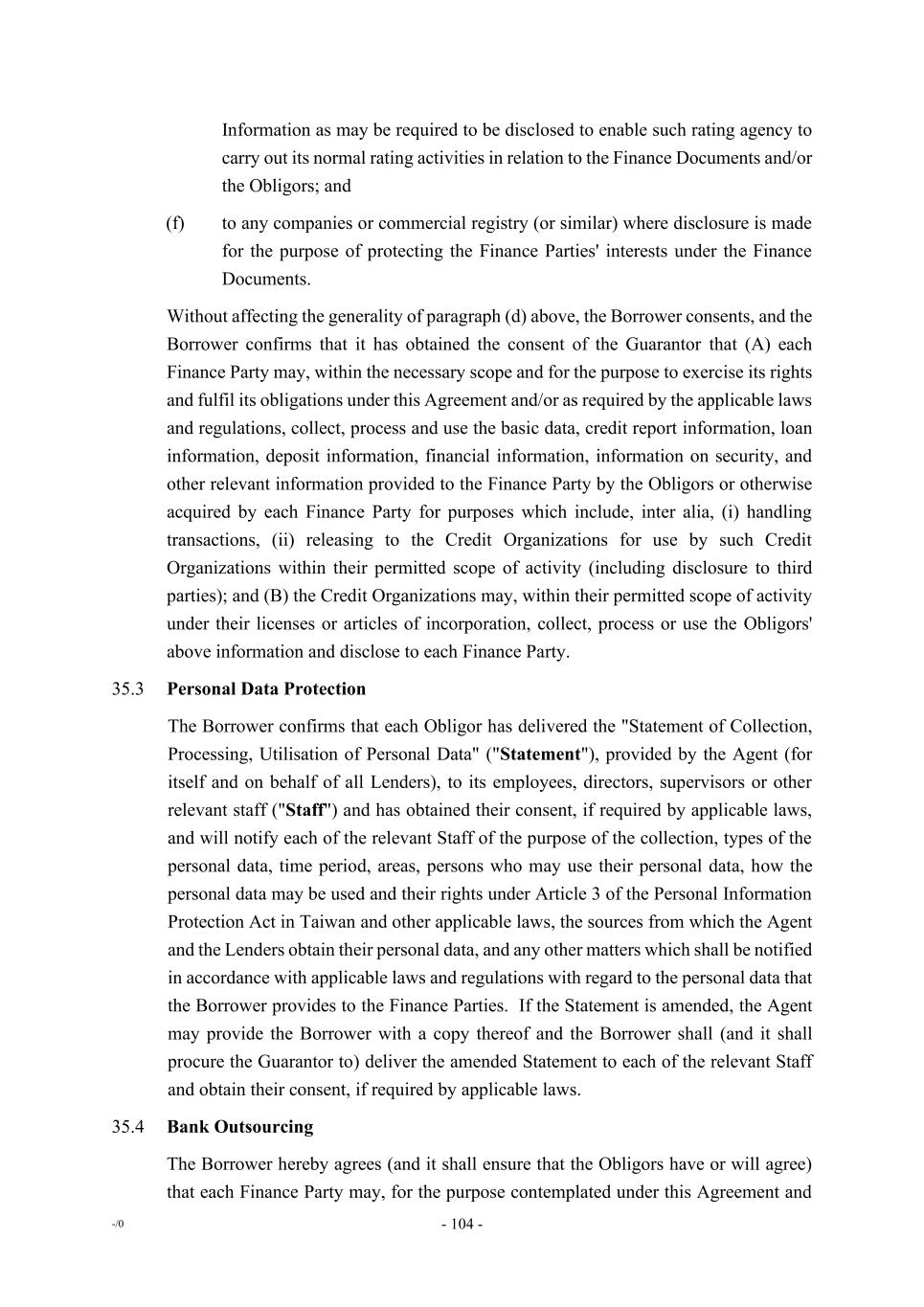 -/0 - 104 - Information as may be required to be disclosed to enable such rating agency to carry out its normal rating activities in relation to the Finance Documents and/or the Obligors; and (f) to any companies or commercial registry (or similar) where disclosure is made for the purpose of protecting the Finance Parties' interests under the Finance Documents. Without affecting the generality of paragraph (d) above, the Borrower consents, and the Borrower confirms that it has obtained the consent of the Guarantor that (A) each Finance Party may, within the necessary scope and for the purpose to exercise its rights and fulfil its obligations under this Agreement and/or as required by the applicable laws and regulations, collect, process and use the basic data, credit report information, loan information, deposit information, financial information, information on security, and other relevant information provided to the Finance Party by the Obligors or otherwise acquired by each Finance Party for purposes which include, inter alia, (i) handling transactions, (ii) releasing to the Credit Organizations for use by such Credit Organizations within their permitted scope of activity (including disclosure to third parties); and (B) the Credit Organizations may, within their permitted scope of activity under their licenses or articles of incorporation, collect, process or use the Obligors' above information and disclose to each Finance Party. 35.3 Personal Data Protection The Borrower confirms that each Obligor has delivered the "Statement of Collection, Processing, Utilisation of Personal Data" ("Statement"), provided by the Agent (for itself and on behalf of all Lenders), to its employees, directors, supervisors or other relevant staff ("Staff") and has obtained their consent, if required by applicable laws, and will notify each of the relevant Staff of the purpose of the collection, types of the personal data, time period, areas, persons who may use their personal data, how the personal data may be used and their rights under Article 3 of the Personal Information Protection Act in Taiwan and other applicable laws, the sources from which the Agent and the Lenders obtain their personal data, and any other matters which shall be notified in accordance with applicable laws and regulations with regard to the personal data that the Borrower provides to the Finance Parties. If the Statement is amended, the Agent may provide the Borrower with a copy thereof and the Borrower shall (and it shall procure the Guarantor to) deliver the amended Statement to each of the relevant Staff and obtain their consent, if required by applicable laws. 35.4 Bank Outsourcing The Borrower hereby agrees (and it shall ensure that the Obligors have or will agree) that each Finance Party may, for the purpose contemplated under this Agreement and