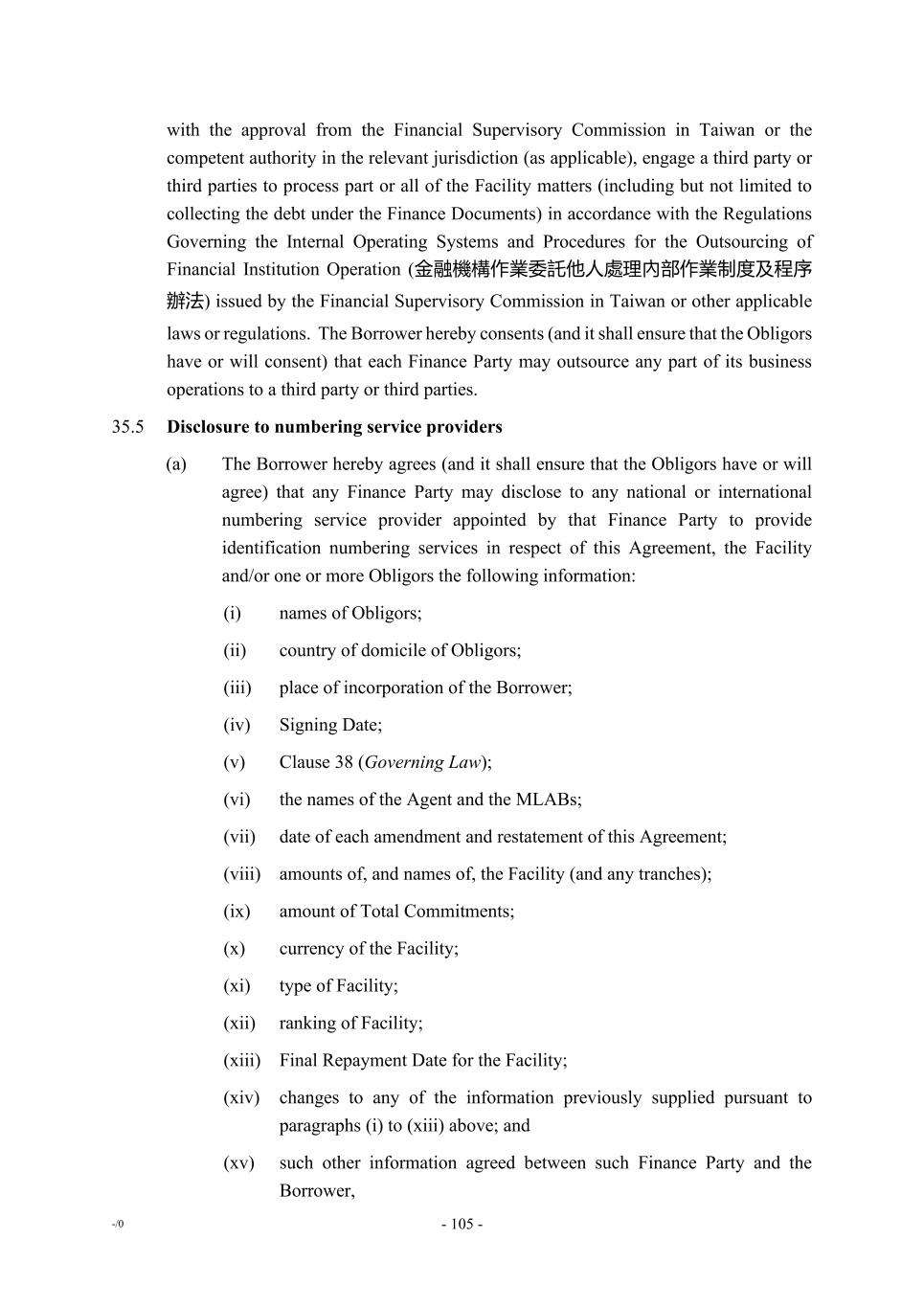 -/0 - 105 - with the approval from the Financial Supervisory Commission in Taiwan or the competent authority in the relevant jurisdiction (as applicable), engage a third party or third parties to process part or all of the Facility matters (including but not limited to collecting the debt under the Finance Documents) in accordance with the Regulations Governing the Internal Operating Systems and Procedures for the Outsourcing of Financial Institution Operation (金融機構作業委託他人處理內部作業制度及程序 辦法) issued by the Financial Supervisory Commission in Taiwan or other applicable laws or regulations. The Borrower hereby consents (and it shall ensure that the Obligors have or will consent) that each Finance Party may outsource any part of its business operations to a third party or third parties. 35.5 Disclosure to numbering service providers (a) The Borrower hereby agrees (and it shall ensure that the Obligors have or will agree) that any Finance Party may disclose to any national or international numbering service provider appointed by that Finance Party to provide identification numbering services in respect of this Agreement, the Facility and/or one or more Obligors the following information: (i) names of Obligors; (ii) country of domicile of Obligors; (iii) place of incorporation of the Borrower; (iv) Signing Date; (v) Clause 38 (Governing Law); (vi) the names of the Agent and the MLABs; (vii) date of each amendment and restatement of this Agreement; (viii) amounts of, and names of, the Facility (and any tranches); (ix) amount of Total Commitments; (x) currency of the Facility; (xi) type of Facility; (xii) ranking of Facility; (xiii) Final Repayment Date for the Facility; (xiv) changes to any of the information previously supplied pursuant to paragraphs (i) to (xiii) above; and (xv) such other information agreed between such Finance Party and the Borrower,