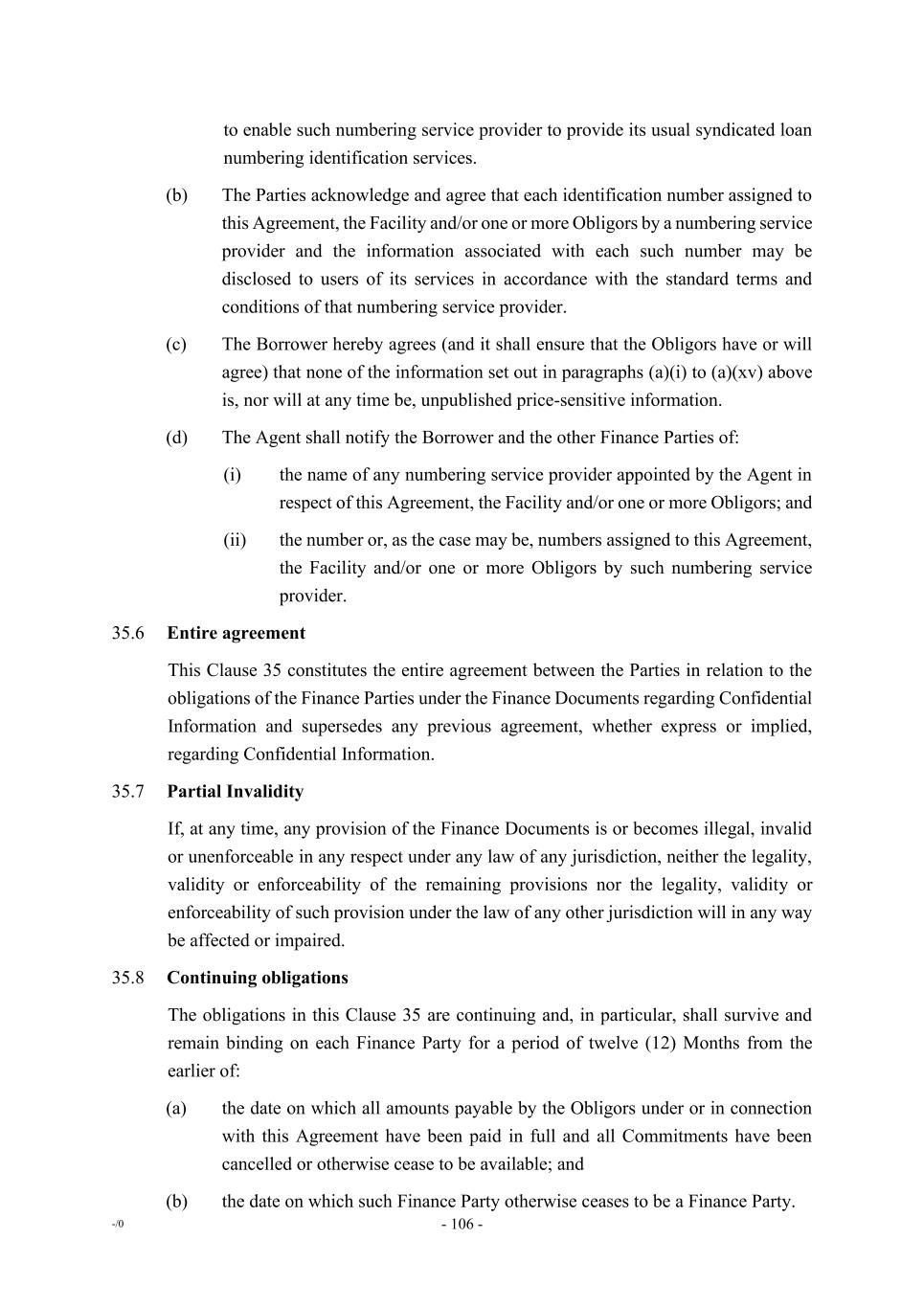 -/0 - 106 - to enable such numbering service provider to provide its usual syndicated loan numbering identification services. (b) The Parties acknowledge and agree that each identification number assigned to this Agreement, the Facility and/or one or more Obligors by a numbering service provider and the information associated with each such number may be disclosed to users of its services in accordance with the standard terms and conditions of that numbering service provider. (c) The Borrower hereby agrees (and it shall ensure that the Obligors have or will agree) that none of the information set out in paragraphs (a)(i) to (a)(xv) above is, nor will at any time be, unpublished price-sensitive information. (d) The Agent shall notify the Borrower and the other Finance Parties of: (i) the name of any numbering service provider appointed by the Agent in respect of this Agreement, the Facility and/or one or more Obligors; and (ii) the number or, as the case may be, numbers assigned to this Agreement, the Facility and/or one or more Obligors by such numbering service provider. 35.6 Entire agreement This Clause 35 constitutes the entire agreement between the Parties in relation to the obligations of the Finance Parties under the Finance Documents regarding Confidential Information and supersedes any previous agreement, whether express or implied, regarding Confidential Information. 35.7 Partial Invalidity If, at any time, any provision of the Finance Documents is or becomes illegal, invalid or unenforceable in any respect under any law of any jurisdiction, neither the legality, validity or enforceability of the remaining provisions nor the legality, validity or enforceability of such provision under the law of any other jurisdiction will in any way be affected or impaired. 35.8 Continuing obligations The obligations in this Clause 35 are continuing and, in particular, shall survive and remain binding on each Finance Party for a period of twelve (12) Months from the earlier of: (a) the date on which all amounts payable by the Obligors under or in connection with this Agreement have been paid in full and all Commitments have been cancelled or otherwise cease to be available; and (b) the date on which such Finance Party otherwise ceases to be a Finance Party.