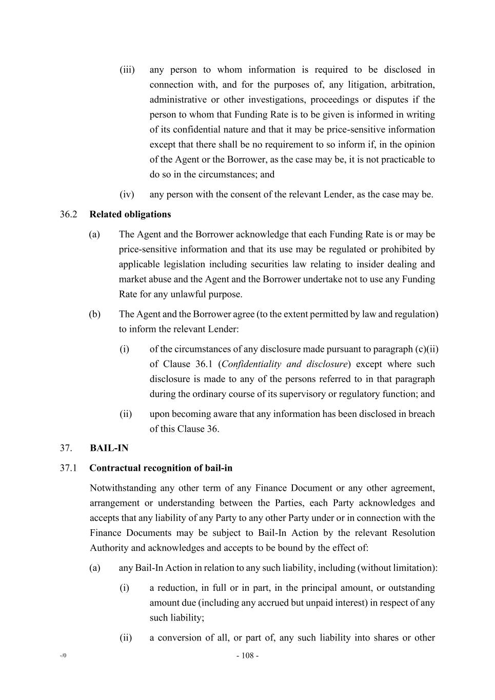 -/0 - 108 - (iii) any person to whom information is required to be disclosed in connection with, and for the purposes of, any litigation, arbitration, administrative or other investigations, proceedings or disputes if the person to whom that Funding Rate is to be given is informed in writing of its confidential nature and that it may be price-sensitive information except that there shall be no requirement to so inform if, in the opinion of the Agent or the Borrower, as the case may be, it is not practicable to do so in the circumstances; and (iv) any person with the consent of the relevant Lender, as the case may be. 36.2 Related obligations (a) The Agent and the Borrower acknowledge that each Funding Rate is or may be price-sensitive information and that its use may be regulated or prohibited by applicable legislation including securities law relating to insider dealing and market abuse and the Agent and the Borrower undertake not to use any Funding Rate for any unlawful purpose. (b) The Agent and the Borrower agree (to the extent permitted by law and regulation) to inform the relevant Lender: (i) of the circumstances of any disclosure made pursuant to paragraph (c)(ii) of Clause 36.1 (Confidentiality and disclosure) except where such disclosure is made to any of the persons referred to in that paragraph during the ordinary course of its supervisory or regulatory function; and (ii) upon becoming aware that any information has been disclosed in breach of this Clause 36. 37. BAIL-IN 37.1 Contractual recognition of bail-in Notwithstanding any other term of any Finance Document or any other agreement, arrangement or understanding between the Parties, each Party acknowledges and accepts that any liability of any Party to any other Party under or in connection with the Finance Documents may be subject to Bail-In Action by the relevant Resolution Authority and acknowledges and accepts to be bound by the effect of: (a) any Bail-In Action in relation to any such liability, including (without limitation): (i) a reduction, in full or in part, in the principal amount, or outstanding amount due (including any accrued but unpaid interest) in respect of any such liability; (ii) a conversion of all, or part of, any such liability into shares or other