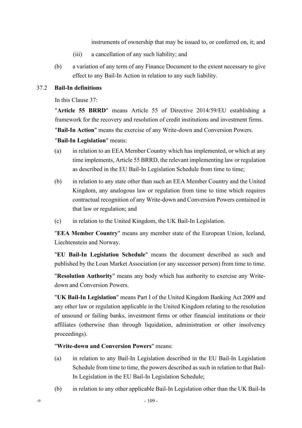 -/0 - 109 - instruments of ownership that may be issued to, or conferred on, it; and (iii) a cancellation of any such liability; and (b) a variation of any term of any Finance Document to the extent necessary to give effect to any Bail-In Action in relation to any such liability. 37.2 Bail-In definitions In this Clause 37: "Article 55 BRRD" means Article 55 of Directive 2014/59/EU establishing a framework for the recovery and resolution of credit institutions and investment firms. "Bail-In Action" means the exercise of any Write-down and Conversion Powers. "Bail-In Legislation" means: (a) in relation to an EEA Member Country which has implemented, or which at any time implements, Article 55 BRRD, the relevant implementing law or regulation as described in the EU Bail-In Legislation Schedule from time to time; (b) in relation to any state other than such an EEA Member Country and the United Kingdom, any analogous law or regulation from time to time which requires contractual recognition of any Write-down and Conversion Powers contained in that law or regulation; and (c) in relation to the United Kingdom, the UK Bail-In Legislation. "EEA Member Country" means any member state of the European Union, Iceland, Liechtenstein and Norway. "EU Bail-In Legislation Schedule" means the document described as such and published by the Loan Market Association (or any successor person) from time to time. "Resolution Authority" means any body which has authority to exercise any Write- down and Conversion Powers. "UK Bail-In Legislation" means Part I of the United Kingdom Banking Act 2009 and any other law or regulation applicable in the United Kingdom relating to the resolution of unsound or failing banks, investment firms or other financial institutions or their affiliates (otherwise than through liquidation, administration or other insolvency proceedings). "Write-down and Conversion Powers" means: (a) in relation to any Bail-In Legislation described in the EU Bail-In Legislation Schedule from time to time, the powers described as such in relation to that Bail- In Legislation in the EU Bail-In Legislation Schedule; (b) in relation to any other applicable Bail-In Legislation other than the UK Bail-In