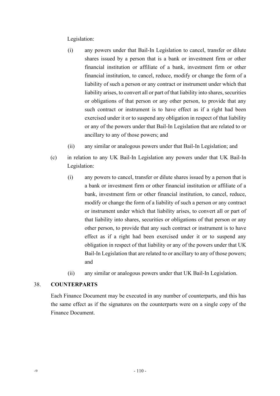 -/0 - 110 - Legislation: (i) any powers under that Bail-In Legislation to cancel, transfer or dilute shares issued by a person that is a bank or investment firm or other financial institution or affiliate of a bank, investment firm or other financial institution, to cancel, reduce, modify or change the form of a liability of such a person or any contract or instrument under which that liability arises, to convert all or part of that liability into shares, securities or obligations of that person or any other person, to provide that any such contract or instrument is to have effect as if a right had been exercised under it or to suspend any obligation in respect of that liability or any of the powers under that Bail-In Legislation that are related to or ancillary to any of those powers; and (ii) any similar or analogous powers under that Bail-In Legislation; and (c) in relation to any UK Bail-In Legislation any powers under that UK Bail-In Legislation: (i) any powers to cancel, transfer or dilute shares issued by a person that is a bank or investment firm or other financial institution or affiliate of a bank, investment firm or other financial institution, to cancel, reduce, modify or change the form of a liability of such a person or any contract or instrument under which that liability arises, to convert all or part of that liability into shares, securities or obligations of that person or any other person, to provide that any such contract or instrument is to have effect as if a right had been exercised under it or to suspend any obligation in respect of that liability or any of the powers under that UK Bail-In Legislation that are related to or ancillary to any of those powers; and (ii) any similar or analogous powers under that UK Bail-In Legislation. 38. COUNTERPARTS Each Finance Document may be executed in any number of counterparts, and this has the same effect as if the signatures on the counterparts were on a single copy of the Finance Document.