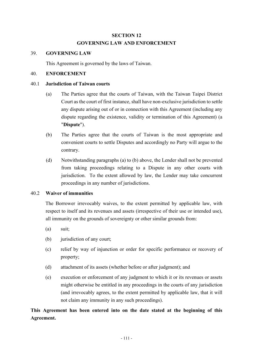 - 111 - SECTION 12 GOVERNING LAW AND ENFORCEMENT 39. GOVERNING LAW This Agreement is governed by the laws of Taiwan. 40. ENFORCEMENT 40.1 Jurisdiction of Taiwan courts (a) The Parties agree that the courts of Taiwan, with the Taiwan Taipei District Court as the court of first instance, shall have non-exclusive jurisdiction to settle any dispute arising out of or in connection with this Agreement (including any dispute regarding the existence, validity or termination of this Agreement) (a "Dispute"). (b) The Parties agree that the courts of Taiwan is the most appropriate and convenient courts to settle Disputes and accordingly no Party will argue to the contrary. (d) Notwithstanding paragraphs (a) to (b) above, the Lender shall not be prevented from taking proceedings relating to a Dispute in any other courts with jurisdiction. To the extent allowed by law, the Lender may take concurrent proceedings in any number of jurisdictions. 40.2 Waiver of immunities The Borrower irrevocably waives, to the extent permitted by applicable law, with respect to itself and its revenues and assets (irrespective of their use or intended use), all immunity on the grounds of sovereignty or other similar grounds from: (a) suit; (b) jurisdiction of any court; (c) relief by way of injunction or order for specific performance or recovery of property; (d) attachment of its assets (whether before or after judgment); and (e) execution or enforcement of any judgment to which it or its revenues or assets might otherwise be entitled in any proceedings in the courts of any jurisdiction (and irrevocably agrees, to the extent permitted by applicable law, that it will not claim any immunity in any such proceedings). This Agreement has been entered into on the date stated at the beginning of this Agreement.