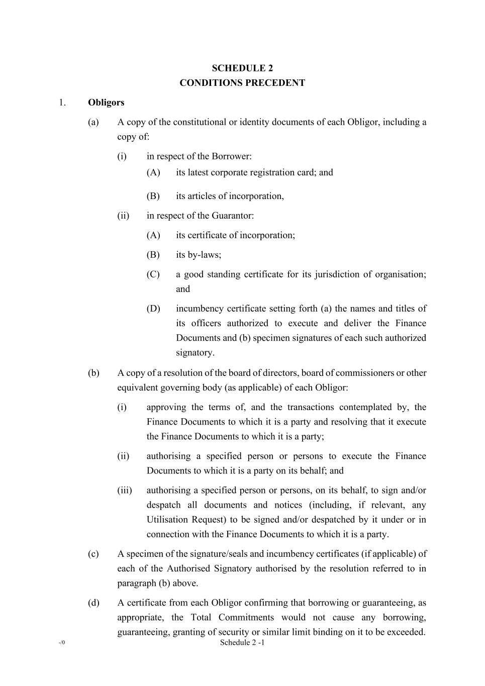 -/0 Schedule 2 -1 SCHEDULE 2 CONDITIONS PRECEDENT 1. Obligors (a) A copy of the constitutional or identity documents of each Obligor, including a copy of: (i) in respect of the Borrower: (A) its latest corporate registration card; and (B) its articles of incorporation, (ii) in respect of the Guarantor: (A) its certificate of incorporation; (B) its by-laws; (C) a good standing certificate for its jurisdiction of organisation; and (D) incumbency certificate setting forth (a) the names and titles of its officers authorized to execute and deliver the Finance Documents and (b) specimen signatures of each such authorized signatory. (b) A copy of a resolution of the board of directors, board of commissioners or other equivalent governing body (as applicable) of each Obligor: (i) approving the terms of, and the transactions contemplated by, the Finance Documents to which it is a party and resolving that it execute the Finance Documents to which it is a party; (ii) authorising a specified person or persons to execute the Finance Documents to which it is a party on its behalf; and (iii) authorising a specified person or persons, on its behalf, to sign and/or despatch all documents and notices (including, if relevant, any Utilisation Request) to be signed and/or despatched by it under or in connection with the Finance Documents to which it is a party. (c) A specimen of the signature/seals and incumbency certificates (if applicable) of each of the Authorised Signatory authorised by the resolution referred to in paragraph (b) above. (d) A certificate from each Obligor confirming that borrowing or guaranteeing, as appropriate, the Total Commitments would not cause any borrowing, guaranteeing, granting of security or similar limit binding on it to be exceeded.