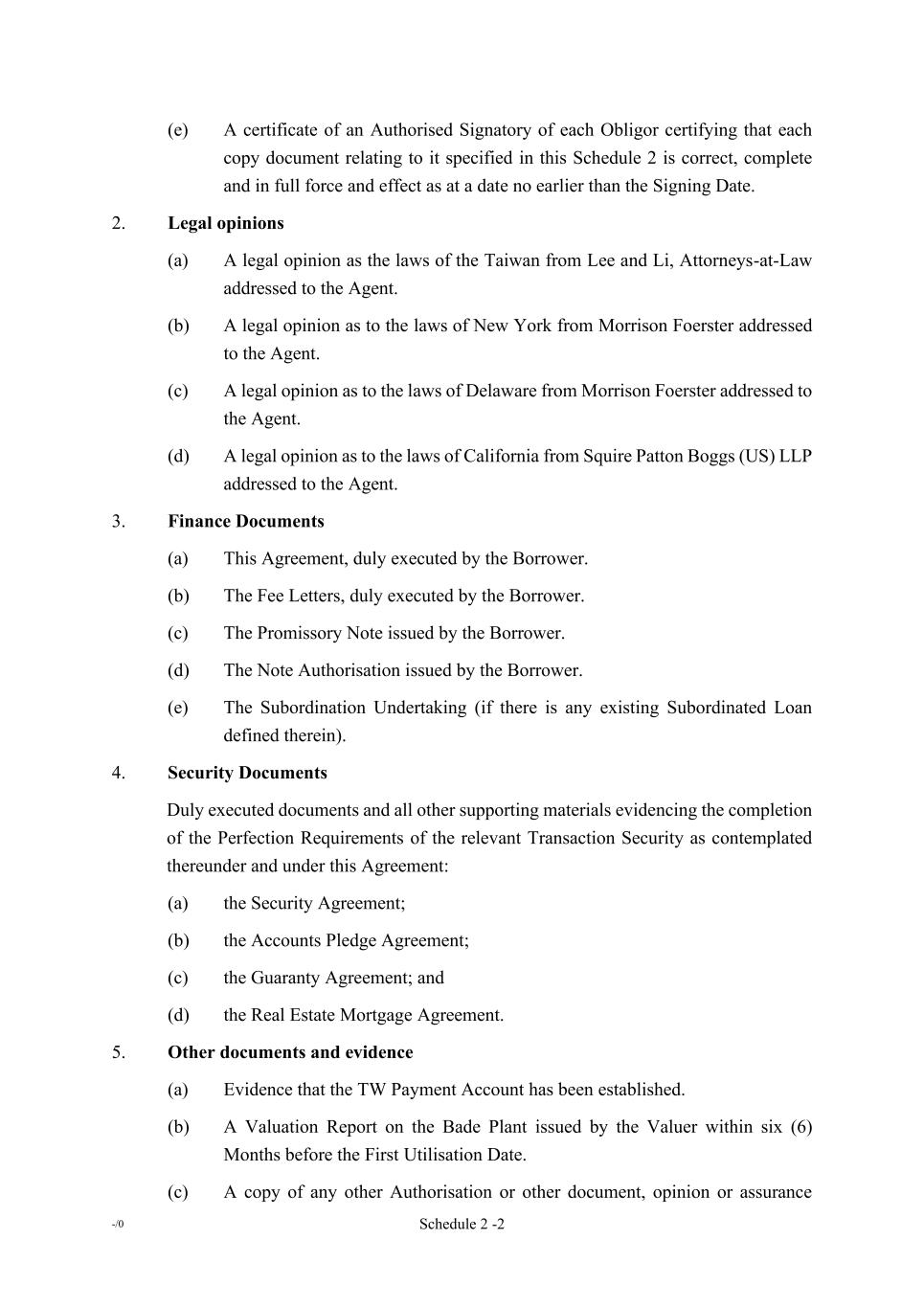 -/0 Schedule 2 -2 (e) A certificate of an Authorised Signatory of each Obligor certifying that each copy document relating to it specified in this Schedule 2 is correct, complete and in full force and effect as at a date no earlier than the Signing Date. 2. Legal opinions (a) A legal opinion as the laws of the Taiwan from Lee and Li, Attorneys-at-Law addressed to the Agent. (b) A legal opinion as to the laws of New York from Morrison Foerster addressed to the Agent. (c) A legal opinion as to the laws of Delaware from Morrison Foerster addressed to the Agent. (d) A legal opinion as to the laws of California from Squire Patton Boggs (US) LLP addressed to the Agent. 3. Finance Documents (a) This Agreement, duly executed by the Borrower. (b) The Fee Letters, duly executed by the Borrower. (c) The Promissory Note issued by the Borrower. (d) The Note Authorisation issued by the Borrower. (e) The Subordination Undertaking (if there is any existing Subordinated Loan defined therein). 4. Security Documents Duly executed documents and all other supporting materials evidencing the completion of the Perfection Requirements of the relevant Transaction Security as contemplated thereunder and under this Agreement: (a) the Security Agreement; (b) the Accounts Pledge Agreement; (c) the Guaranty Agreement; and (d) the Real Estate Mortgage Agreement. 5. Other documents and evidence (a) Evidence that the TW Payment Account has been established. (b) A Valuation Report on the Bade Plant issued by the Valuer within six (6) Months before the First Utilisation Date. (c) A copy of any other Authorisation or other document, opinion or assurance