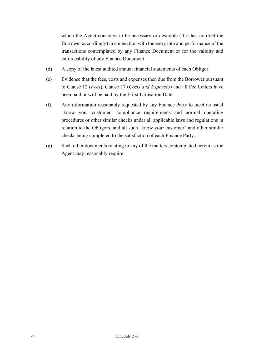 -/0 Schedule 2 -3 which the Agent considers to be necessary or desirable (if it has notified the Borrower accordingly) in connection with the entry into and performance of the transactions contemplated by any Finance Document or for the validity and enforceability of any Finance Document. (d) A copy of the latest audited annual financial statements of each Obligor. (e) Evidence that the fees, costs and expenses then due from the Borrower pursuant to Clause 12 (Fees), Clause 17 (Costs and Expenses) and all Fee Letters have been paid or will be paid by the Ffirst Utilisation Date. (f) Any information reasonably requested by any Finance Party to meet its usual "know your customer" compliance requirements and normal operating procedures or other similar checks under all applicable laws and regulations in relation to the Obligors, and all such "know your customer" and other similar checks being completed to the satisfaction of each Finance Party. (g) Such other documents relating to any of the matters contemplated herein as the Agent may reasonably require.