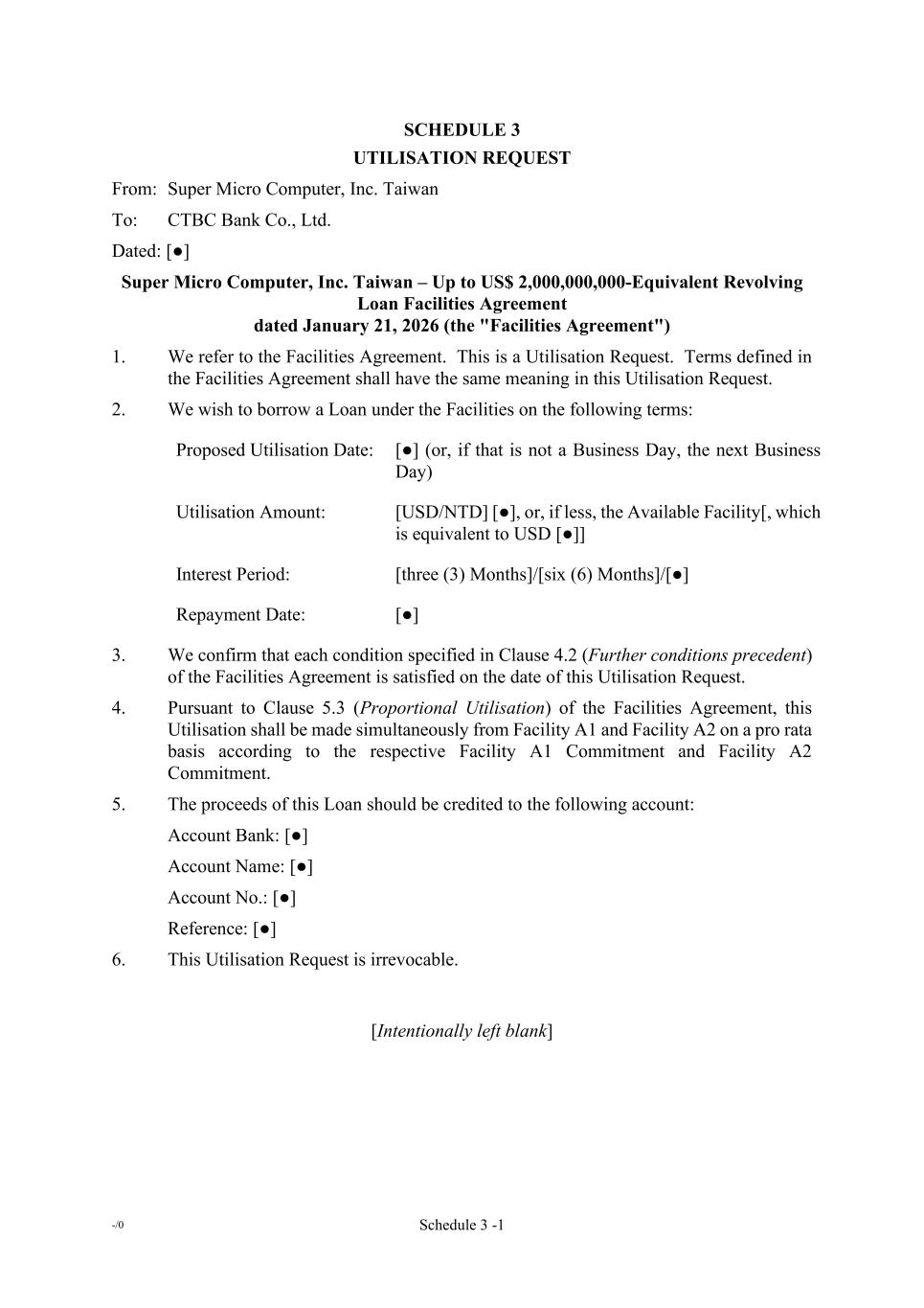 -/0 Schedule 3 -1 SCHEDULE 3 UTILISATION REQUEST From: Super Micro Computer, Inc. Taiwan To: CTBC Bank Co., Ltd. Dated: [●] Super Micro Computer, Inc. Taiwan – Up to US$ 2,000,000,000-Equivalent Revolving Loan Facilities Agreement dated January 21, 2026 (the "Facilities Agreement") 1. We refer to the Facilities Agreement. This is a Utilisation Request. Terms defined in the Facilities Agreement shall have the same meaning in this Utilisation Request. 2. We wish to borrow a Loan under the Facilities on the following terms: Proposed Utilisation Date: [●] (or, if that is not a Business Day, the next Business Day) Utilisation Amount: [USD/NTD] [●], or, if less, the Available Facility[, which is equivalent to USD [●]] Interest Period: [three (3) Months]/[six (6) Months]/[●] Repayment Date: [●] 3. We confirm that each condition specified in Clause 4.2 (Further conditions precedent) of the Facilities Agreement is satisfied on the date of this Utilisation Request. 4. Pursuant to Clause 5.3 (Proportional Utilisation) of the Facilities Agreement, this Utilisation shall be made simultaneously from Facility A1 and Facility A2 on a pro rata basis according to the respective Facility A1 Commitment and Facility A2 Commitment. 5. The proceeds of this Loan should be credited to the following account: Account Bank: [●] Account Name: [●] Account No.: [●] Reference: [●] 6. This Utilisation Request is irrevocable. [Intentionally left blank]