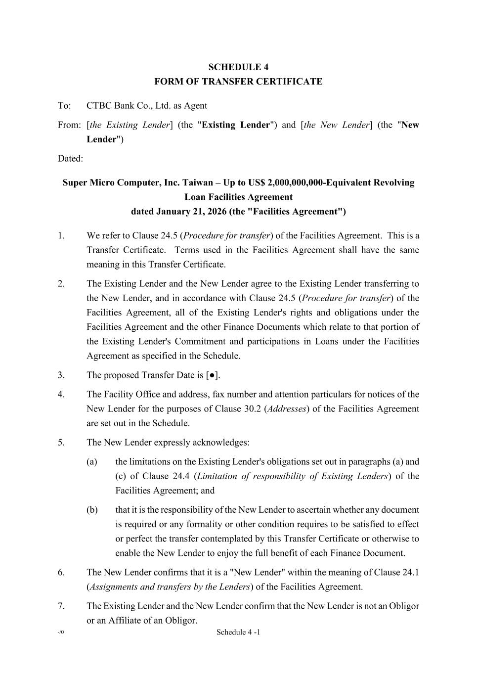 -/0 Schedule 4 -1 SCHEDULE 4 FORM OF TRANSFER CERTIFICATE To: CTBC Bank Co., Ltd. as Agent From: [the Existing Lender] (the "Existing Lender") and [the New Lender] (the "New Lender") Dated: Super Micro Computer, Inc. Taiwan – Up to US$ 2,000,000,000-Equivalent Revolving Loan Facilities Agreement dated January 21, 2026 (the "Facilities Agreement") 1. We refer to Clause 24.5 (Procedure for transfer) of the Facilities Agreement. This is a Transfer Certificate. Terms used in the Facilities Agreement shall have the same meaning in this Transfer Certificate. 2. The Existing Lender and the New Lender agree to the Existing Lender transferring to the New Lender, and in accordance with Clause 24.5 (Procedure for transfer) of the Facilities Agreement, all of the Existing Lender's rights and obligations under the Facilities Agreement and the other Finance Documents which relate to that portion of the Existing Lender's Commitment and participations in Loans under the Facilities Agreement as specified in the Schedule. 3. The proposed Transfer Date is [●]. 4. The Facility Office and address, fax number and attention particulars for notices of the New Lender for the purposes of Clause 30.2 (Addresses) of the Facilities Agreement are set out in the Schedule. 5. The New Lender expressly acknowledges: (a) the limitations on the Existing Lender's obligations set out in paragraphs (a) and (c) of Clause 24.4 (Limitation of responsibility of Existing Lenders) of the Facilities Agreement; and (b) that it is the responsibility of the New Lender to ascertain whether any document is required or any formality or other condition requires to be satisfied to effect or perfect the transfer contemplated by this Transfer Certificate or otherwise to enable the New Lender to enjoy the full benefit of each Finance Document. 6. The New Lender confirms that it is a "New Lender" within the meaning of Clause 24.1 (Assignments and transfers by the Lenders) of the Facilities Agreement. 7. The Existing Lender and the New Lender confirm that the New Lender is not an Obligor or an Affiliate of an Obligor.