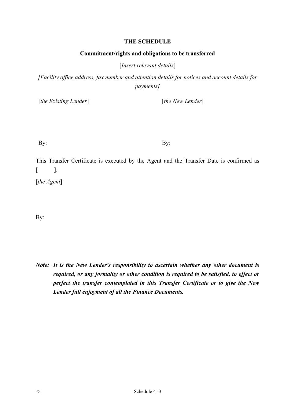 -/0 Schedule 4 -3 THE SCHEDULE Commitment/rights and obligations to be transferred [Insert relevant details] [Facility office address, fax number and attention details for notices and account details for payments] [the Existing Lender] [the New Lender] By: By: This Transfer Certificate is executed by the Agent and the Transfer Date is confirmed as [ ]. [the Agent] By: Note: It is the New Lender's responsibility to ascertain whether any other document is required, or any formality or other condition is required to be satisfied, to effect or perfect the transfer contemplated in this Transfer Certificate or to give the New Lender full enjoyment of all the Finance Documents.