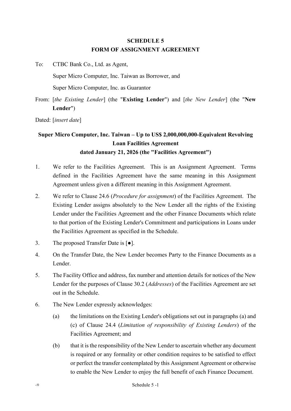 -/0 Schedule 5 -1 SCHEDULE 5 FORM OF ASSIGNMENT AGREEMENT To: CTBC Bank Co., Ltd. as Agent, Super Micro Computer, Inc. Taiwan as Borrower, and Super Micro Computer, Inc. as Guarantor From: [the Existing Lender] (the "Existing Lender") and [the New Lender] (the "New Lender") Dated: [insert date] Super Micro Computer, Inc. Taiwan – Up to US$ 2,000,000,000-Equivalent Revolving Loan Facilities Agreement dated January 21, 2026 (the "Facilities Agreement") 1. We refer to the Facilities Agreement. This is an Assignment Agreement. Terms defined in the Facilities Agreement have the same meaning in this Assignment Agreement unless given a different meaning in this Assignment Agreement. 2. We refer to Clause 24.6 (Procedure for assignment) of the Facilities Agreement. The Existing Lender assigns absolutely to the New Lender all the rights of the Existing Lender under the Facilities Agreement and the other Finance Documents which relate to that portion of the Existing Lender's Commitment and participations in Loans under the Facilities Agreement as specified in the Schedule. 3. The proposed Transfer Date is [●]. 4. On the Transfer Date, the New Lender becomes Party to the Finance Documents as a Lender. 5. The Facility Office and address, fax number and attention details for notices of the New Lender for the purposes of Clause 30.2 (Addresses) of the Facilities Agreement are set out in the Schedule. 6. The New Lender expressly acknowledges: (a) the limitations on the Existing Lender's obligations set out in paragraphs (a) and (c) of Clause 24.4 (Limitation of responsibility of Existing Lenders) of the Facilities Agreement; and (b) that it is the responsibility of the New Lender to ascertain whether any document is required or any formality or other condition requires to be satisfied to effect or perfect the transfer contemplated by this Assignment Agreement or otherwise to enable the New Lender to enjoy the full benefit of each Finance Document.