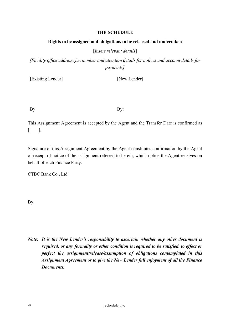 -/0 Schedule 5 -3 THE SCHEDULE Rights to be assigned and obligations to be released and undertaken [Insert relevant details] [Facility office address, fax number and attention details for notices and account details for payments] [Existing Lender] [New Lender] By: By: This Assignment Agreement is accepted by the Agent and the Transfer Date is confirmed as [ ]. Signature of this Assignment Agreement by the Agent constitutes confirmation by the Agent of receipt of notice of the assignment referred to herein, which notice the Agent receives on behalf of each Finance Party. CTBC Bank Co., Ltd. By: Note: It is the New Lender's responsibility to ascertain whether any other document is required, or any formality or other condition is required to be satisfied, to effect or perfect the assignment/release/assumption of obligations contemplated in this Assignment Agreement or to give the New Lender full enjoyment of all the Finance Documents.