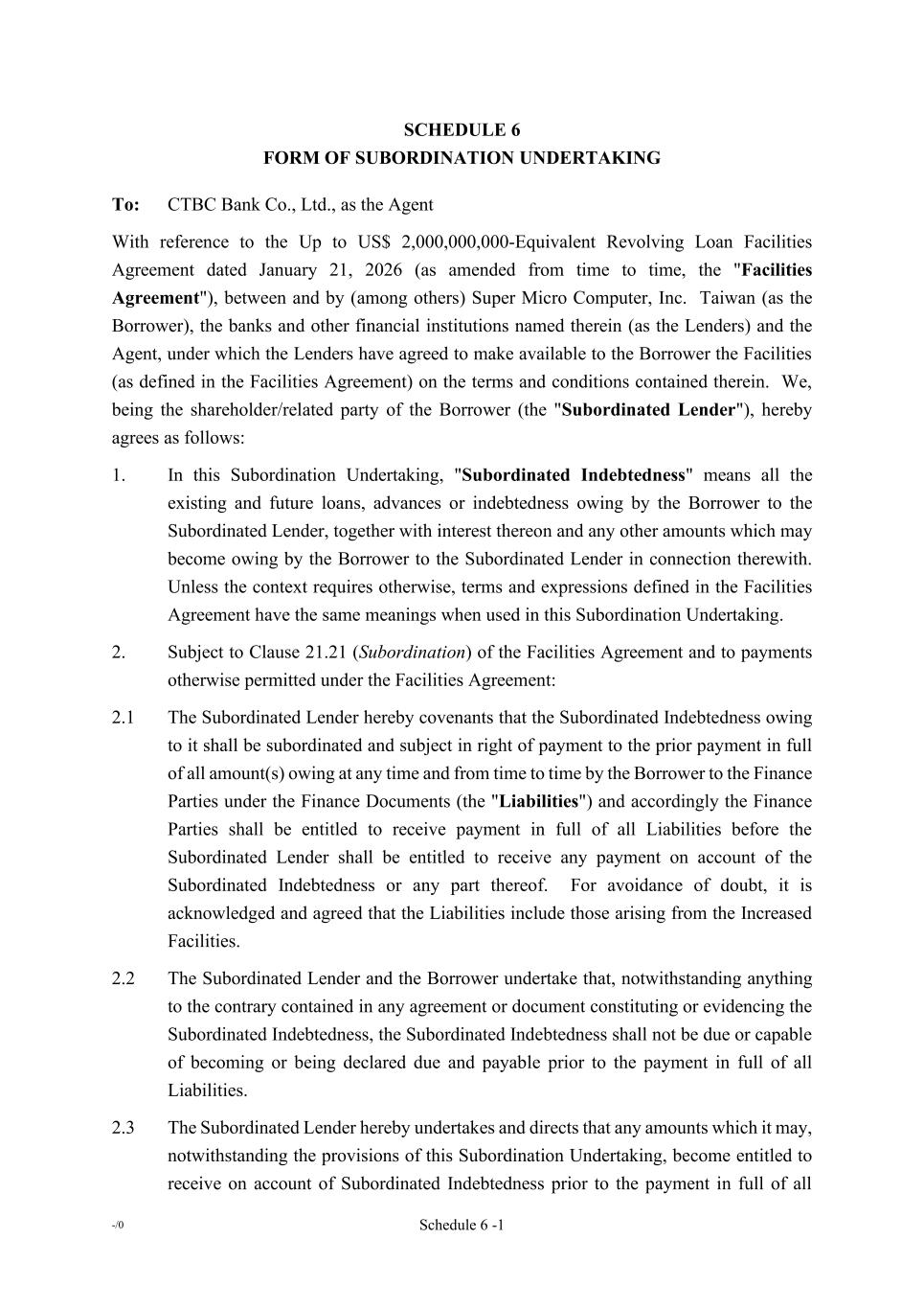 -/0 Schedule 6 -1 SCHEDULE 6 FORM OF SUBORDINATION UNDERTAKING To: CTBC Bank Co., Ltd., as the Agent With reference to the Up to US$ 2,000,000,000-Equivalent Revolving Loan Facilities Agreement dated January 21, 2026 (as amended from time to time, the "Facilities Agreement"), between and by (among others) Super Micro Computer, Inc. Taiwan (as the Borrower), the banks and other financial institutions named therein (as the Lenders) and the Agent, under which the Lenders have agreed to make available to the Borrower the Facilities (as defined in the Facilities Agreement) on the terms and conditions contained therein. We, being the shareholder/related party of the Borrower (the "Subordinated Lender"), hereby agrees as follows: 1. In this Subordination Undertaking, "Subordinated Indebtedness" means all the existing and future loans, advances or indebtedness owing by the Borrower to the Subordinated Lender, together with interest thereon and any other amounts which may become owing by the Borrower to the Subordinated Lender in connection therewith. Unless the context requires otherwise, terms and expressions defined in the Facilities Agreement have the same meanings when used in this Subordination Undertaking. 2. Subject to Clause 21.21 (Subordination) of the Facilities Agreement and to payments otherwise permitted under the Facilities Agreement: 2.1 The Subordinated Lender hereby covenants that the Subordinated Indebtedness owing to it shall be subordinated and subject in right of payment to the prior payment in full of all amount(s) owing at any time and from time to time by the Borrower to the Finance Parties under the Finance Documents (the "Liabilities") and accordingly the Finance Parties shall be entitled to receive payment in full of all Liabilities before the Subordinated Lender shall be entitled to receive any payment on account of the Subordinated Indebtedness or any part thereof. For avoidance of doubt, it is acknowledged and agreed that the Liabilities include those arising from the Increased Facilities. 2.2 The Subordinated Lender and the Borrower undertake that, notwithstanding anything to the contrary contained in any agreement or document constituting or evidencing the Subordinated Indebtedness, the Subordinated Indebtedness shall not be due or capable of becoming or being declared due and payable prior to the payment in full of all Liabilities. 2.3 The Subordinated Lender hereby undertakes and directs that any amounts which it may, notwithstanding the provisions of this Subordination Undertaking, become entitled to receive on account of Subordinated Indebtedness prior to the payment in full of all