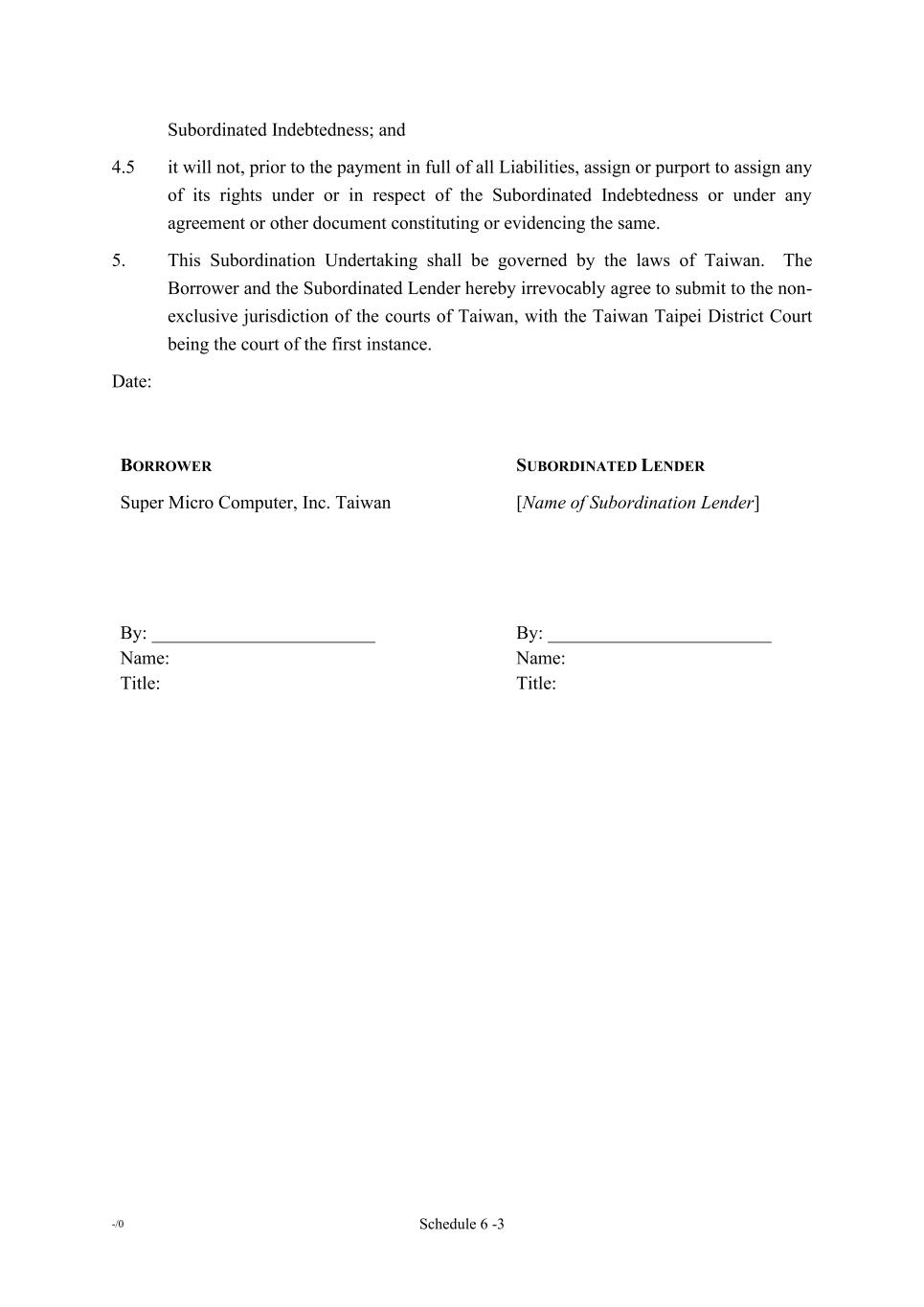 -/0 Schedule 6 -3 Subordinated Indebtedness; and 4.5 it will not, prior to the payment in full of all Liabilities, assign or purport to assign any of its rights under or in respect of the Subordinated Indebtedness or under any agreement or other document constituting or evidencing the same. 5. This Subordination Undertaking shall be governed by the laws of Taiwan. The Borrower and the Subordinated Lender hereby irrevocably agree to submit to the non- exclusive jurisdiction of the courts of Taiwan, with the Taiwan Taipei District Court being the court of the first instance. Date: BORROWER Super Micro Computer, Inc. Taiwan SUBORDINATED LENDER [Name of Subordination Lender] By: ________________________ Name: Title: By: ________________________ Name: Title: