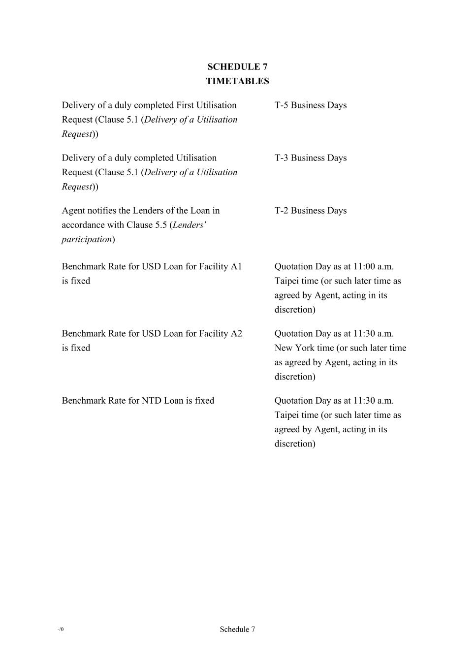 -/0 Schedule 7 SCHEDULE 7 TIMETABLES Delivery of a duly completed First Utilisation Request (Clause 5.1 (Delivery of a Utilisation Request)) T-5 Business Days Delivery of a duly completed Utilisation Request (Clause 5.1 (Delivery of a Utilisation Request)) T-3 Business Days Agent notifies the Lenders of the Loan in accordance with Clause 5.5 (Lenders' participation) T-2 Business Days Benchmark Rate for USD Loan for Facility A1 is fixed Quotation Day as at 11:00 a.m. Taipei time (or such later time as agreed by Agent, acting in its discretion) Benchmark Rate for USD Loan for Facility A2 is fixed Quotation Day as at 11:30 a.m. New York time (or such later time as agreed by Agent, acting in its discretion) Benchmark Rate for NTD Loan is fixed Quotation Day as at 11:30 a.m. Taipei time (or such later time as agreed by Agent, acting in its discretion)