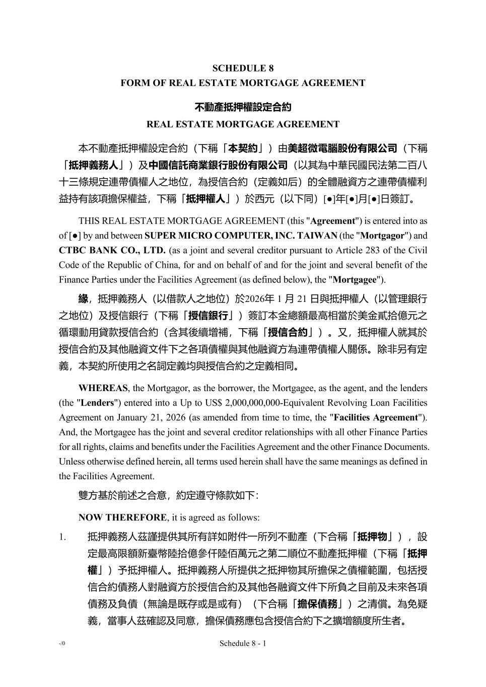 -/0 Schedule 8 - 1 SCHEDULE 8 FORM OF REAL ESTATE MORTGAGE AGREEMENT 不動產抵押權設定合約 REAL ESTATE MORTGAGE AGREEMENT 本不動產抵押權設定合約(下稱「本契約」)由美超微電腦股份有限公司(下稱 「抵押義務人」)及中國信託商業銀行股份有限公司(以其為中華民國民法第二百八 十三條規定連帶債權人之地位,為授信合約(定義如后)的全體融資方之連帶債權利 益持有該項擔保權益,下稱「抵押權人」)於西元(以下同)[●]年[●]月[●]日簽訂。 THIS REAL ESTATE MORTGAGE AGREEMENT (this "Agreement") is entered into as of [●] by and between SUPER MICRO COMPUTER, INC. TAIWAN (the "Mortgagor") and CTBC BANK CO., LTD. (as a joint and several creditor pursuant to Article 283 of the Civil Code of the Republic of China, for and on behalf of and for the joint and several benefit of the Finance Parties under the Facilities Agreement (as defined below), the "Mortgagee"). 緣,抵押義務人(以借款人之地位)於2026年 1 月 21 日與抵押權人(以管理銀行 之地位)及授信銀行(下稱「授信銀行」)簽訂本金總額最高相當於美金貳拾億元之 循環動用貸款授信合約(含其後續增補,下稱「授信合約」)。又,抵押權人就其於 授信合約及其他融資文件下之各項債權與其他融資方為連帶債權人關係。除非另有定 義,本契約所使用之名詞定義均與授信合約之定義相同。 WHEREAS, the Mortgagor, as the borrower, the Mortgagee, as the agent, and the lenders (the "Lenders") entered into a Up to US$ 2,000,000,000-Equivalent Revolving Loan Facilities Agreement on January 21, 2026 (as amended from time to time, the "Facilities Agreement"). And, the Mortgagee has the joint and several creditor relationships with all other Finance Parties for all rights, claims and benefits under the Facilities Agreement and the other Finance Documents. Unless otherwise defined herein, all terms used herein shall have the same meanings as defined in the Facilities Agreement. 雙方基於前述之合意,約定遵守條款如下: NOW THEREFORE, it is agreed as follows: 1. 抵押義務人茲謹提供其所有詳如附件一所列不動產(下合稱「抵押物」),設 定最高限額新臺幣陸拾億參仟陸佰萬元之第二順位不動產抵押權(下稱「抵押 權」)予抵押權人。抵押義務人所提供之抵押物其所擔保之債權範圍,包括授 信合約債務人對融資方於授信合約及其他各融資文件下所負之目前及未來各項 債務及負債(無論是既存或是或有)(下合稱「擔保債務」)之清償。為免疑 義,當事人茲確認及同意,擔保債務應包含授信合約下之擴增額度所生者。