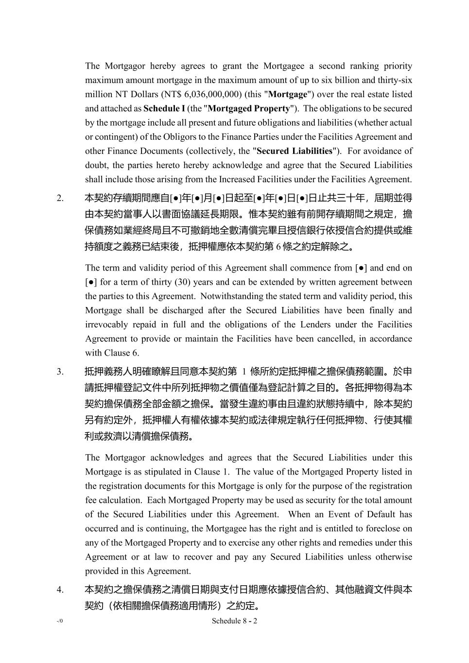 -/0 Schedule 8 - 2 The Mortgagor hereby agrees to grant the Mortgagee a second ranking priority maximum amount mortgage in the maximum amount of up to six billion and thirty-six million NT Dollars (NT$ 6,036,000,000) (this "Mortgage") over the real estate listed and attached as Schedule I (the "Mortgaged Property"). The obligations to be secured by the mortgage include all present and future obligations and liabilities (whether actual or contingent) of the Obligors to the Finance Parties under the Facilities Agreement and other Finance Documents (collectively, the "Secured Liabilities"). For avoidance of doubt, the parties hereto hereby acknowledge and agree that the Secured Liabilities shall include those arising from the Increased Facilities under the Facilities Agreement. 2. 本契約存續期間應自[●]年[●]月[●]日起至[●]年[●]日[●]日止共三十年,屆期並得 由本契約當事人以書面協議延長期限。惟本契約雖有前開存續期間之規定,擔 保債務如業經終局且不可撤銷地全數清償完畢且授信銀行依授信合約提供或維 持額度之義務已結束後,抵押權應依本契約第 6條之約定解除之。 The term and validity period of this Agreement shall commence from [●] and end on [●] for a term of thirty (30) years and can be extended by written agreement between the parties to this Agreement. Notwithstanding the stated term and validity period, this Mortgage shall be discharged after the Secured Liabilities have been finally and irrevocably repaid in full and the obligations of the Lenders under the Facilities Agreement to provide or maintain the Facilities have been cancelled, in accordance with Clause 6. 3. 抵押義務人明確瞭解且同意本契約第 1 條所約定抵押權之擔保債務範圍。於申 請抵押權登記文件中所列抵押物之價值僅為登記計算之目的。各抵押物得為本 契約擔保債務全部金額之擔保。當發生違約事由且違約狀態持續中,除本契約 另有約定外,抵押權人有權依據本契約或法律規定執行任何抵押物、行使其權 利或救濟以清償擔保債務。 The Mortgagor acknowledges and agrees that the Secured Liabilities under this Mortgage is as stipulated in Clause 1. The value of the Mortgaged Property listed in the registration documents for this Mortgage is only for the purpose of the registration fee calculation. Each Mortgaged Property may be used as security for the total amount of the Secured Liabilities under this Agreement. When an Event of Default has occurred and is continuing, the Mortgagee has the right and is entitled to foreclose on any of the Mortgaged Property and to exercise any other rights and remedies under this Agreement or at law to recover and pay any Secured Liabilities unless otherwise provided in this Agreement. 4. 本契約之擔保債務之清償日期與支付日期應依據授信合約、其他融資文件與本 契約(依相關擔保債務適用情形)之約定。