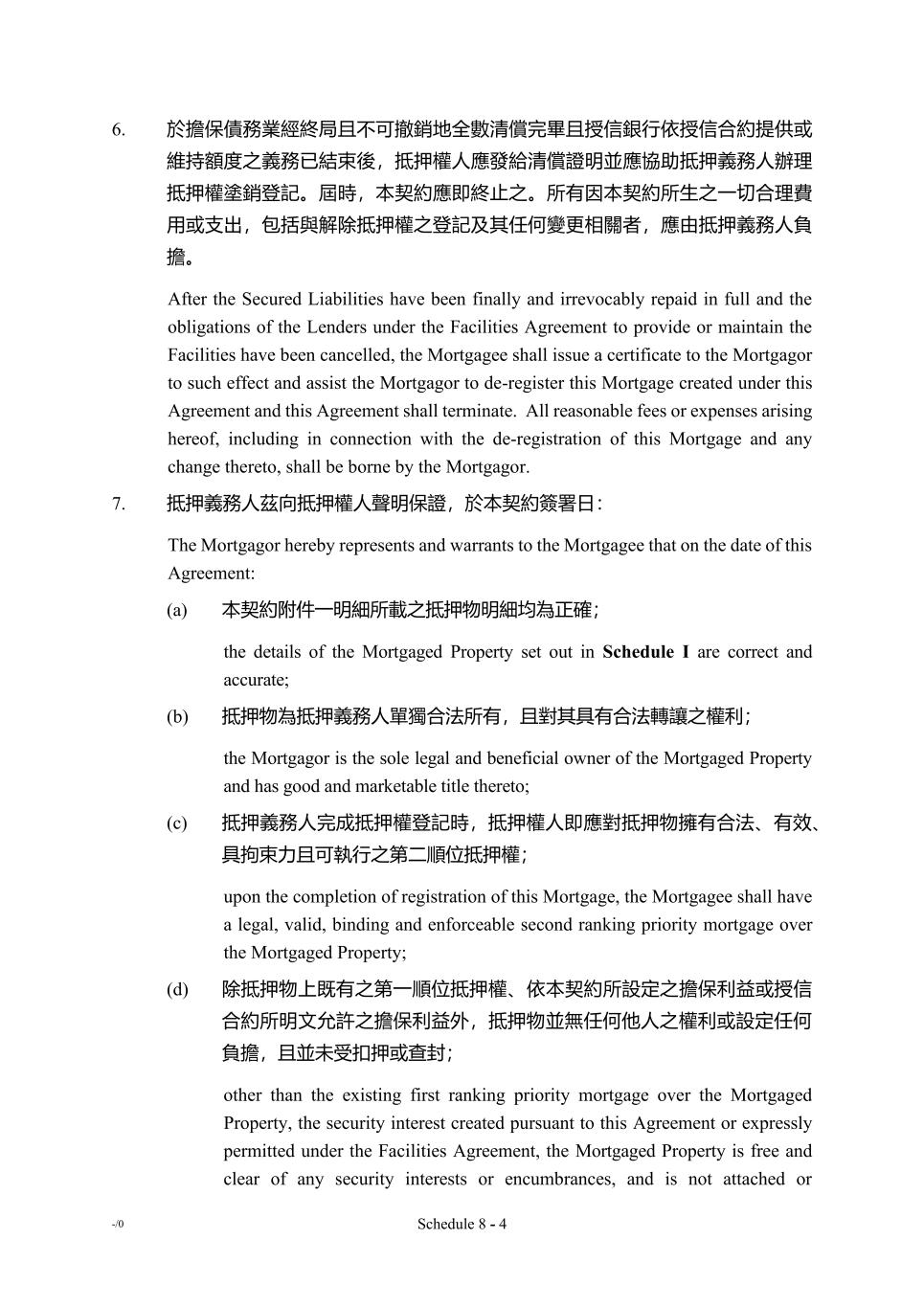 -/0 Schedule 8 - 4 6. 於擔保債務業經終局且不可撤銷地全數清償完畢且授信銀行依授信合約提供或 維持額度之義務已結束後,抵押權人應發給清償證明並應協助抵押義務人辦理 抵押權塗銷登記。屆時,本契約應即終止之。所有因本契約所生之一切合理費 用或支出,包括與解除抵押權之登記及其任何變更相關者,應由抵押義務人負 擔。 After the Secured Liabilities have been finally and irrevocably repaid in full and the obligations of the Lenders under the Facilities Agreement to provide or maintain the Facilities have been cancelled, the Mortgagee shall issue a certificate to the Mortgagor to such effect and assist the Mortgagor to de-register this Mortgage created under this Agreement and this Agreement shall terminate. All reasonable fees or expenses arising hereof, including in connection with the de-registration of this Mortgage and any change thereto, shall be borne by the Mortgagor. 7. 抵押義務人茲向抵押權人聲明保證,於本契約簽署日: The Mortgagor hereby represents and warrants to the Mortgagee that on the date of this Agreement: (a) 本契約附件一明細所載之抵押物明細均為正確; the details of the Mortgaged Property set out in Schedule I are correct and accurate; (b) 抵押物為抵押義務人單獨合法所有,且對其具有合法轉讓之權利; the Mortgagor is the sole legal and beneficial owner of the Mortgaged Property and has good and marketable title thereto; (c) 抵押義務人完成抵押權登記時,抵押權人即應對抵押物擁有合法、有效、 具拘束力且可執行之第二順位抵押權; upon the completion of registration of this Mortgage, the Mortgagee shall have a legal, valid, binding and enforceable second ranking priority mortgage over the Mortgaged Property; (d) 除抵押物上既有之第一順位抵押權、依本契約所設定之擔保利益或授信 合約所明文允許之擔保利益外,抵押物並無任何他人之權利或設定任何 負擔,且並未受扣押或查封; other than the existing first ranking priority mortgage over the Mortgaged Property, the security interest created pursuant to this Agreement or expressly permitted under the Facilities Agreement, the Mortgaged Property is free and clear of any security interests or encumbrances, and is not attached or